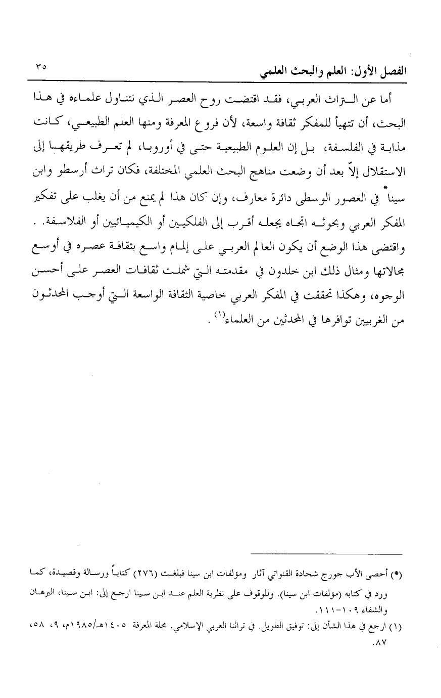 أما عن التراث العربي، فقد اقتضت روح العصر الذي نتناول علماءه في هذا البحث، أن تتهيأ للمفكر ثقافة واسعة، لأن فروع المعرفة ومنها العلم الطبيعي، كانت مذابة في الفلسفة، بل إن العلوم الطبيعية حتى في أوروبا، لم تعرف طريقها إلى الاستقلال إلا بعد أن وضعت مناهج البحث العلمي المختلفة، فكان تراث أرسطو وابن سينا1 في العصور الوسطى دائرة معارف، وإن كان هذا لم يمنع من أن يغلب على تفكير المفكر العربي وبحوثه اتجاه يجعله أقرب إلى الفلكيين أو الكيميائيين أو الفلاسفة. واقتضى هذا الوضع أن يكون العالم العربي على إلمام واسع بثقافة العصر على أحسن الوجوه، وهكذا تحققت في المفكر العربي خاصية الثقافة الواسعة التي أوجبت المحدثون من الغربيين توافرها في المحدثين من العلماء2.