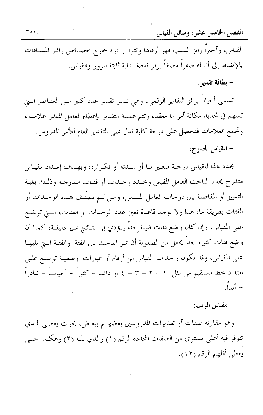 يحدد هذا المقياس درجة متغير ما أو شدته أو تكراره، وبهدف إعداد مقياس متدرج يحدد الباحث العامل المقيس ويحدد وحدات أو فئات متدرجة وذلك بغية التمييز أو المفاضلة بين درجات العامل المقيس، ومن ثم يصنف هذه الوحدات أو الفئات بطريقة ما، هذا ولا يوجد قاعدة تعين عدد الوحدات أو الفئات، التي توضع على المقياس، وإن كان وضع فئات قليلة جدا يؤدي إلى نتائج غير دقيقة، كما أن وضع فئات كثيرة جدا يجعل من الصعوبة أن يميز الباحث بين الفئة والفئة التي تليها على المقياس، وقد تكون واحدات المقياس من أرقام أو عبارات وصفية توضع على امتداد بخط مستقيم من مثل: 1، 2، 3، 4؛ أو دائما، كثيرا، أحيانا، نادرا، أبدا.