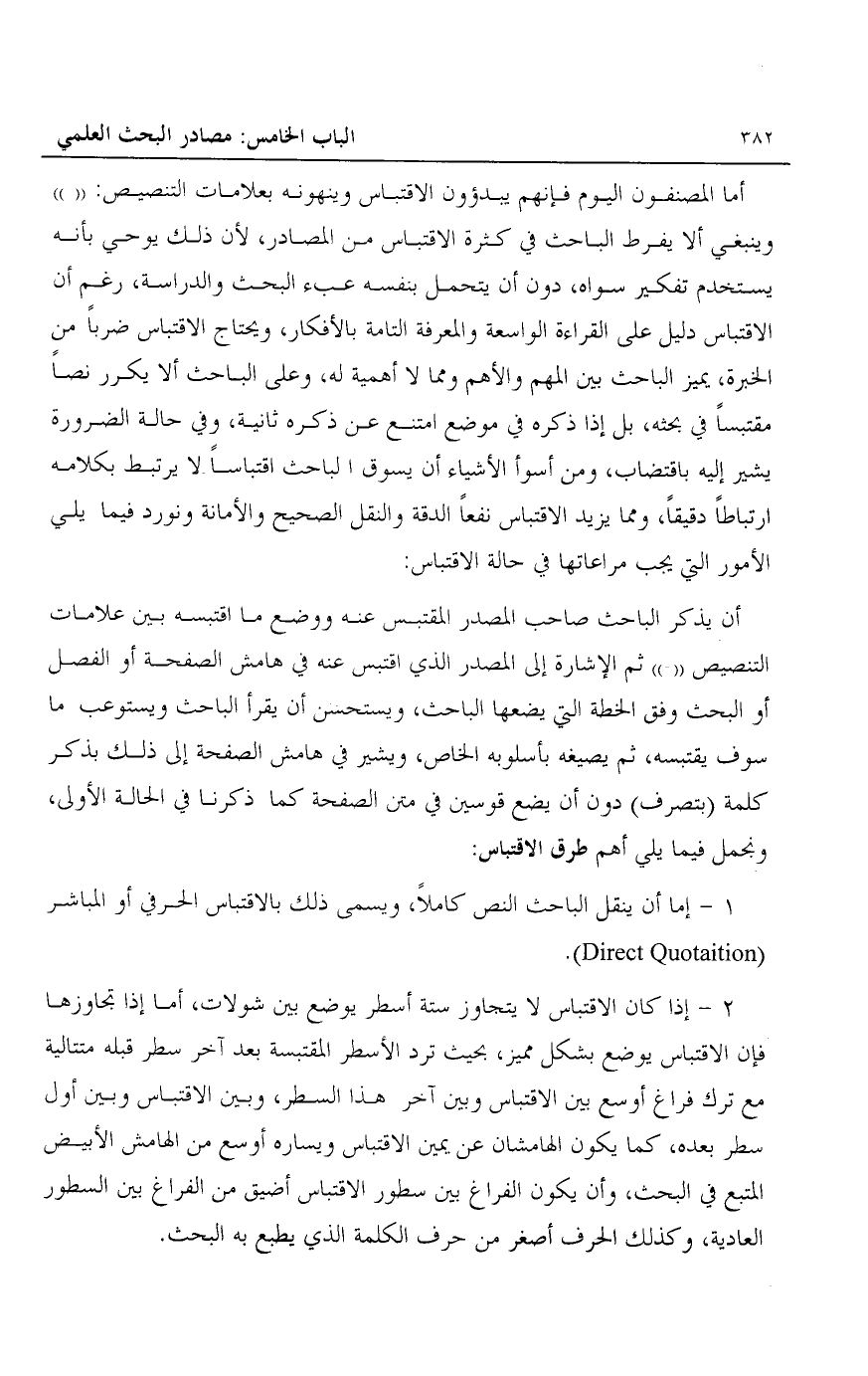 أن يذكر الباحث صاحب المصدر المقتبس عنه ووضع ما اقتبسه بين علامات التنصيص "ثم الإشارة إلى المصدر الذي اقتبس عنه في هامش الصفحة أو الفصل أو البحث وفق الخطة التي يضعها الباحث، ويستحسن أن يقرأ الباحث ويستوعب ما سوف يقتبسه، ثم يصيغه بأسلوبه الخاص، ويشير في هامش الصفحة إلى ذلك بذكر كلمة "بتصرف" دون أن يضع قوسين في متن الصفحة كما ذكرنا في الحالة الأولى، ونجمل فيما يلي أهم طرق الاقتباس: