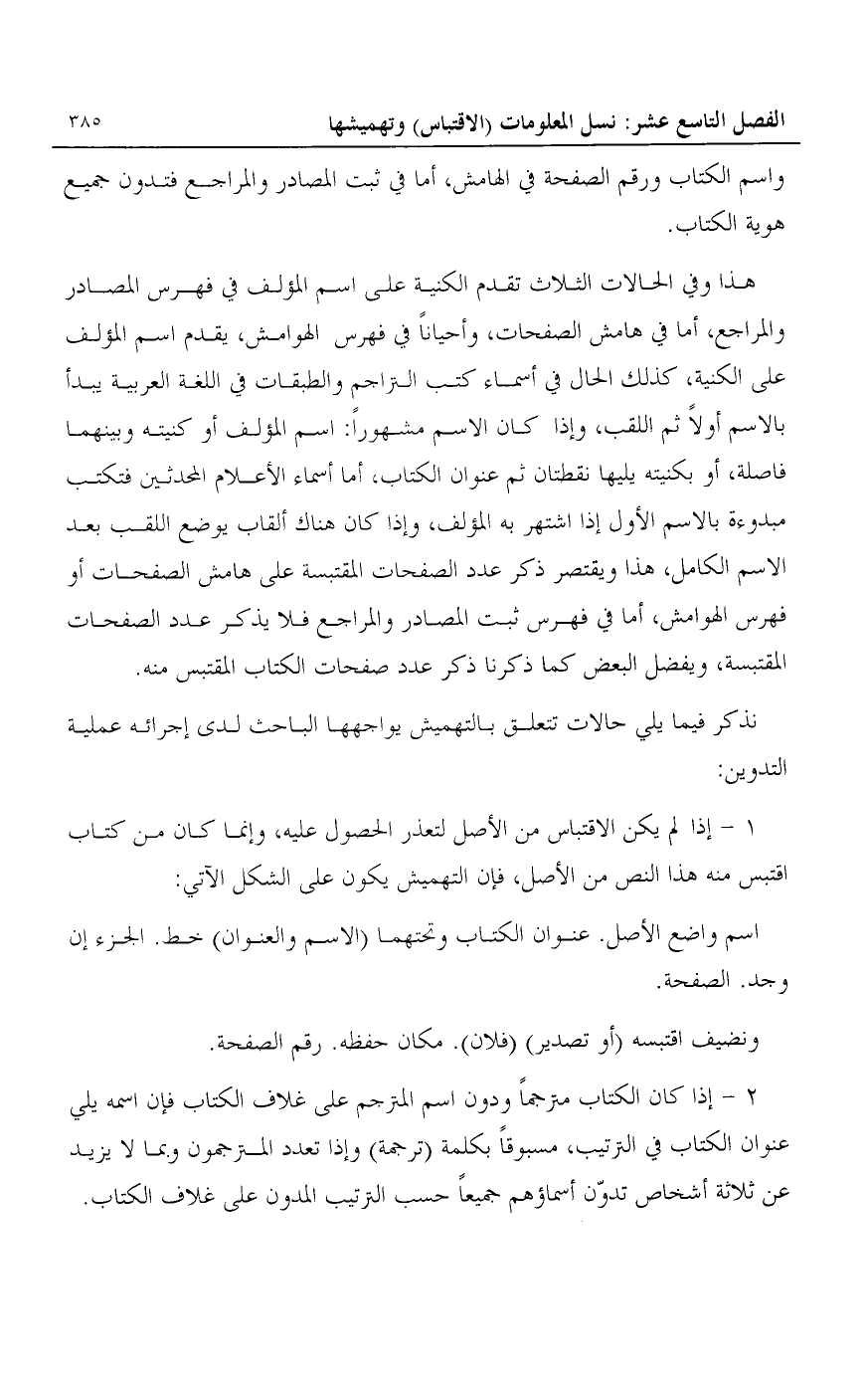1- إذا لم يكن الاقتباس من الأصل لتعذر الحصول عليه، وإنما كان من كتاب اقتبس منه هذا النص من الأصل، فإن التهميش يكون على الشكل الآتي: