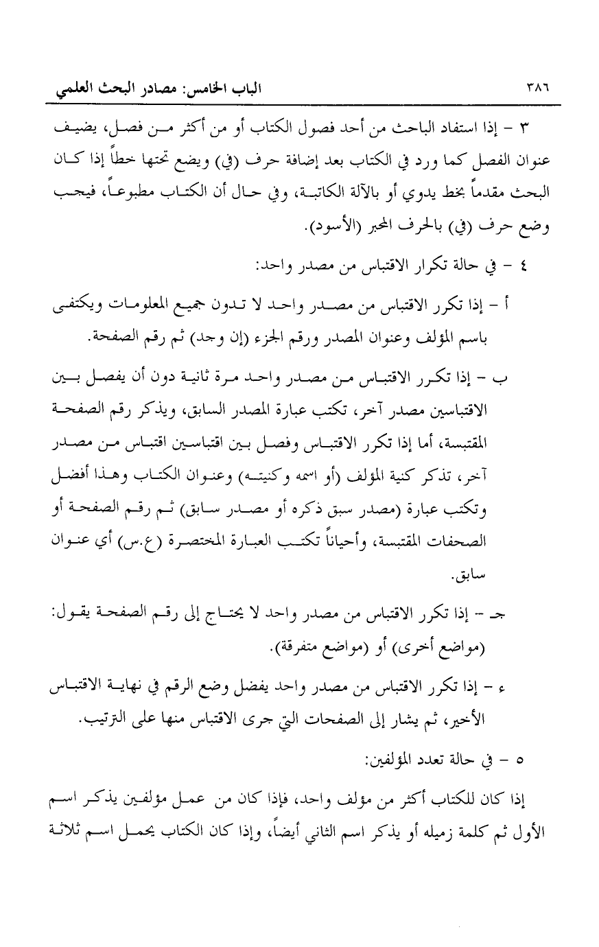 جـ- إذا تكرر الاقتباس من مصدر واحد لا يحتاج إلى رقم الصفحة يقول: "مواضع أخرى" أو "مواضع متفرقة".