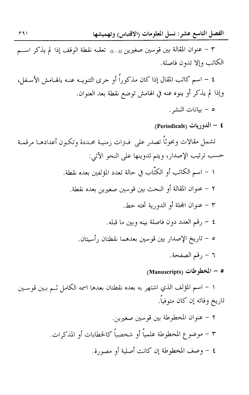 3- عنوان المقالة بين قوسين صغيرين " ... " تعقبه نقطة الوقف إذا لم يذكر اسم الكاتب وإلا تدون فاصلة.