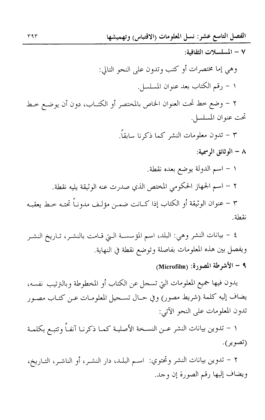 يدون فيها جمع المعلومات التي تسجل عن الكتاب أو المخطوطة وبالترتيب نفسه، يضاف إليه كلمة "شريط مصور" وفي حال تسجيل المعلومات عن كتاب مصور تدون المعلومات على النحو الآتي: