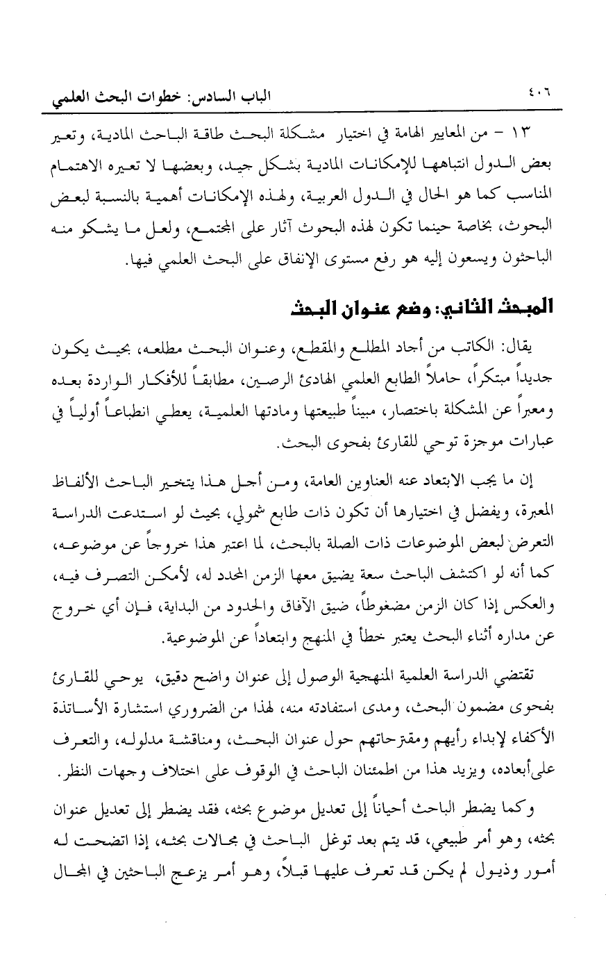 إن ما يجب الابتعاد عنه العناوين العامة، ومن أجل هذا يتخير الباحث الألفاظ المعبرة، ويفضل في اختيارها أن تكون ذات طابع شمولي، بحيث لو استدعت الدراسة التعرض لبعض الموضوعات ذات الصلة بالبحث، لما اعتبر هذا خروجا عن موضوعه، كما أنه لو اكتشف الباحث سعة يضيق معها الزمن المحدد له، لأمكن التصرف فيه، والعكس، إذا كان الزمن مضغوطا، ضيق الآفاق والحدود من البداية، فإن أي خروج عن مداره أثناء البحث يعتبر خطأ في المنهج وابتعادا عن الموضوعية.