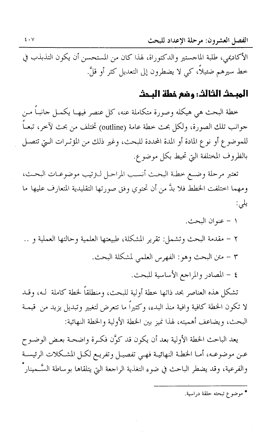 يعد الباحث الخطة الأولية بعد أن يكون قد كون فكرة واضحة بعض الوضوح عن موضوعه، أما الخطة النهائية فهي تفصيل وتفريع لكل المشكلات الرئيسية والفرعية، وقد يضطر الباحث في ضوء التغذية الراجعة التي يتلقاها بوساطة السمينار1