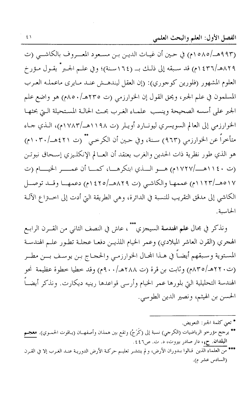 "993هـ/ 1585م" في حين أن غياث الدين بن مسعود المعروف بالكاشي "ت 829هـ/ 1436م" قد سبقه إلى ذلك بـ "164سنة"، وفي علم الجبر1 يقول مؤرخ العلوم المشهور "فلورين كيوجوري": "إن العقل ليندهش عندما يرى ما عمله العرب المسلمون في علم الجبر، ويحق القول إن الخوارزمي "ت 235هـ/ 850م" هو واضع علم الجبر على أسسه الصحيحة وينسب علماء الغرب بحث الحالة المستحيلة التي بحثها الخوارزمي إلى العالم السويسري ليونارد أويلر "ت 1198هـ/ 1783م"، الذي جاء متأخرا عن الخورازمي "963" سنة، وفي حين أن الكرخي2 "ت 421هـ/ 1030م" هو الذي طور نظرية ذات الحدين والغرب يعتقد أن العالم الإنكليزي إسحاق نيوتن "ت 1140هـ/ 1727م" هو الذي ابتكرها، كما إن عمر الخيام "ت 517هـ/ 1123م" عممها والكاشي "ت 829هـ/ 1425م" دعمها وقد توصل الكاشي إلى مدقق التقريب للنسبة في الدائرة، وهي الطريقة التي أدت إلى اختراع الآلة الحاسبة.