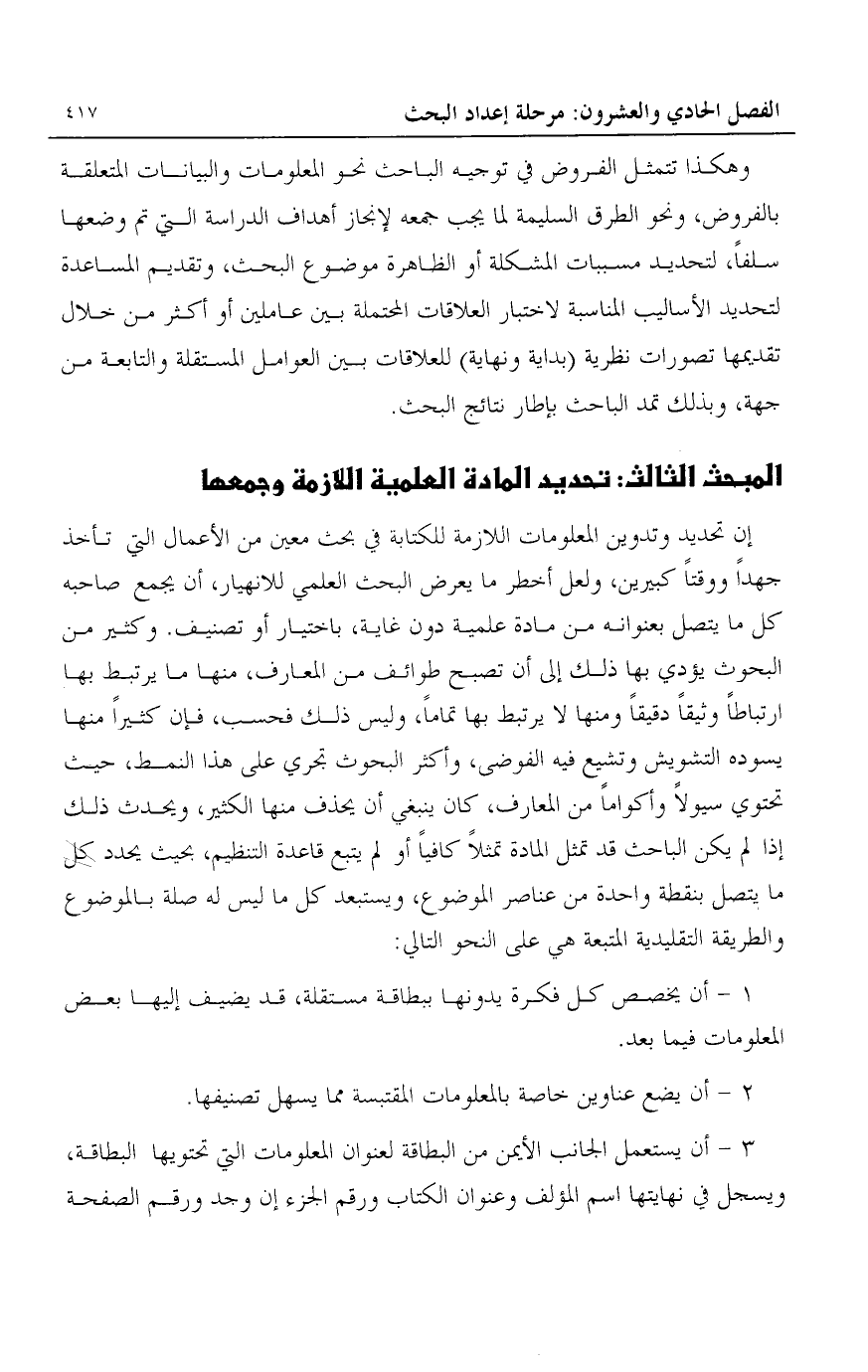 إن تحديد وتدوين المعلومات اللازمة للكتابة في بحث معين من الأعمال التي تأخذ جهدا ووقتا كبيرين، ولعل أخطر ما يعرض البحث العلمي للانهيار، أن يجمع صاحبه كل ما يتصل بعنوانه من مادة علمية دون غاية، باختيار أو تصنيف. وكثير من البحوث يؤدي بها ذلك إلى أن تصبح طوائف من المعارف، منها ما يرتبط بها ارتباطا وثيقا دقيقا ومنها لا يرتبط بها تماما، وليس ذلك فحسب، فإن كثيرا منها يسوده التشويش وتشيع فيه الفوضى، وأكثر البحوث تجري على هذا النمط حيث تحتوي سيولا وأكواما من المعارف، كان ينبغي أن يحذف منها الكثير، ويحدث ذلك إذا لم يكن الباحث قد تمثل المادة تمثلا كافيا أو لم يتبع قاعدة التنظيم، بحيث يحدد كل ما تصل بنقطة واحدة من عناصر الموضوع. ويستبعد كل ما ليس له صلة بالموضوع والطريقة التقليدية المتبعة هي على النحو التالي: