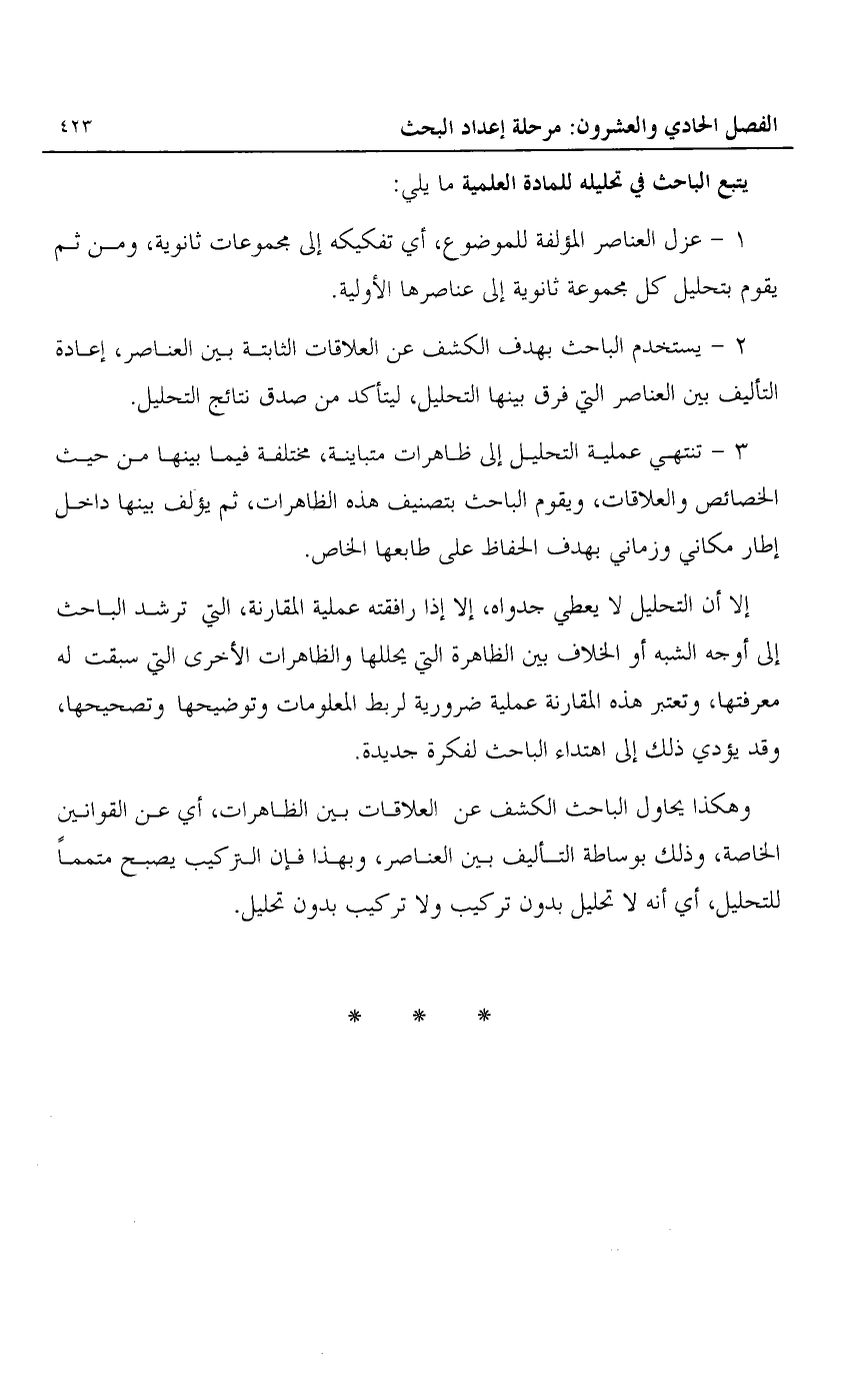 2- يستخدم الباحث بهدف الكشف عن العلاقات الثابتة بين العناصر، إعادة التأليف بين العناصر التي فرق بينها التحليل، ليتأكد من صدق نتائج التحليل.