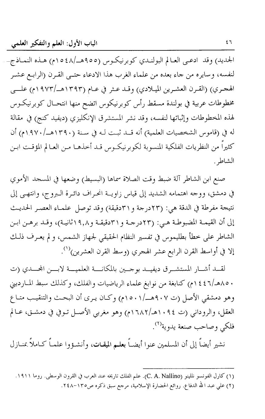 الجديد" وقد ادعى العالم البولندي كوبرنيكوس "955هـ/ 1548م" هذه النماذج لنفسه، وسايره من جاء بعده من علماء الغرب هذا الادعاء حتى القرن "الرابع عشر الهجري" "القرن العشرين الميلادي" وقد عثر في عام "1393هـ/ 1973م" على مخطوطات عربية في بولندة مسقط رأس كوبرنيكوس اتضح منها انتحال كوبرنيكس لهذه المخطوطات وإثباتها لنفسه، وقد نشر المستشرق الإنكليزي "ديفيد كنج" في مقالة له في "قاموس الشخصيات العلمية، أنه قد ثبت له في سنة "1390هـ/ 1970م" أن كثيرا من النظريات الفلكية المنسوبة لكوبرنيكوس قد أخذها من العالم المؤقت ابن الشاطر.