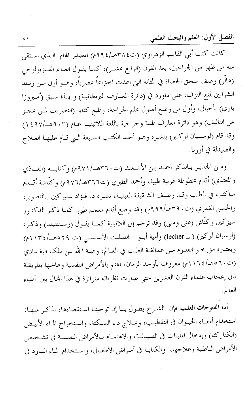 كانت كتب أبي القاسم الزهراوي "ت384هـ/ 994م" المصدر الهام الذي استقى منه من ظهر من الجراحين، بعد القرن "الرابع عشر"، كما يقول العالم الفيزيولوجي "هالر" وصف سحق الحصاة في المثانة التي أعدت اختراعا عصريا، وهو أول من ربط الشرايين لمنع النزف، على ما ورد في "دائرة المعارف البريطانية" وبهذا سبق "أمبروزا باري" بأجيال، وأول من وضع أصول علم الجراحة، وطبع كتابه "التصريف لمن عجز عن التأليف" وهو دائرة معارف طبية وجراحية باللغة اللاتينية عام "903هـ/ 1497م" وقد قام "لوسيان لوكير" بنشره وهو أحد الكتب السبعة التي قام عليها العلاج والصيدلة في أوروبا.