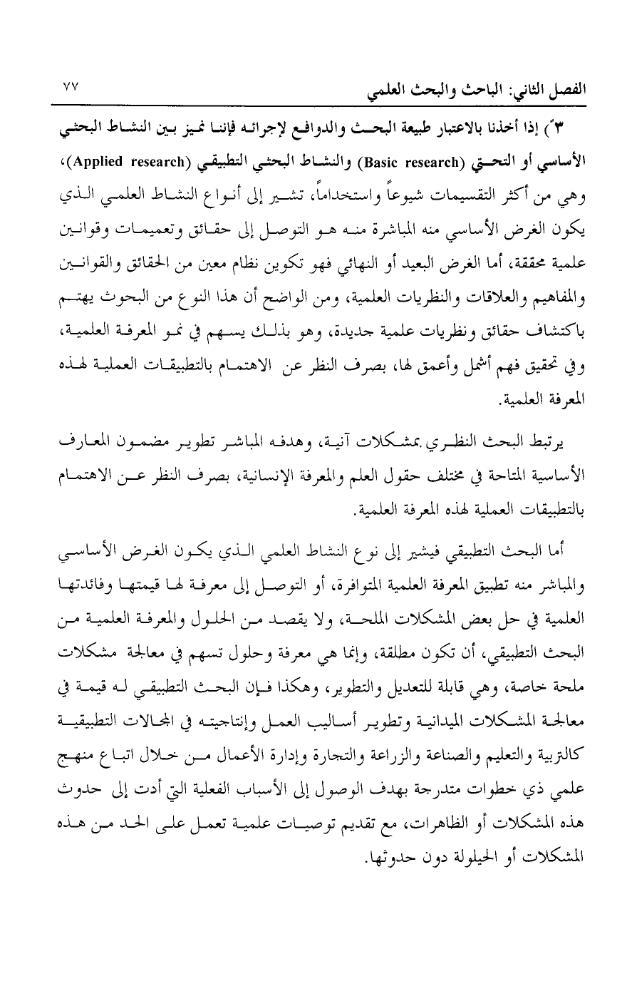 3- إذا أخذنا بالاعتبار طبيعة البحث والدوافع لإجرائه فإننا نميز بين النشاط البحثي الأساسي أو التحتي "Basic Research" والنشاط البحثي التطبيقي "Applied Research"، وهي من أكثر التقسيمات شيوعا واستخداما، تشير إلى أنواع النشاط العملي الذي يكون الغرض الأساسي منه المباشرة منه هو التوصل إلى حقائق وتعميمات وقوانين علمية محققة، أما الغرض البعيد أو النهائي فهو تكوين نظام معين من الحقائق والقوانين والمفاهيم والعلاقات والنظريات العلمية، ومن الواضح أن هذا النوع من البحوث يهتم باكتشاف حقائق ونظريات علمية جديدة، وهو بذلك يسهم في نمو المعرفة العلمية، وفي تحقيق فهم أشمل وأعمق لها، بصرف النظر عن الاهتمام بالتطبيقات العملية لهذه المعرفة العلمية.