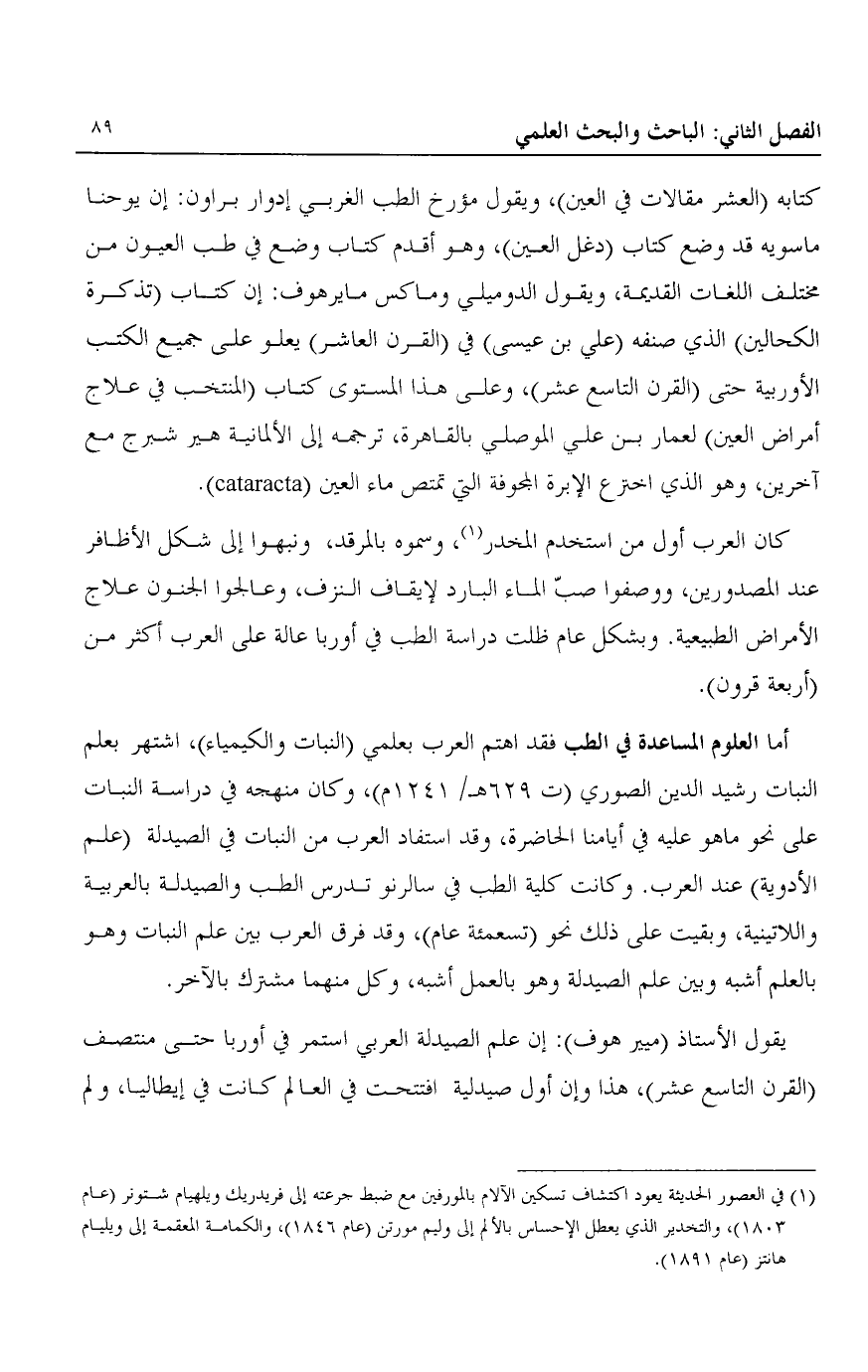 كتابه "العشر مقالات في العين" ويقول مؤرخ الطب الغربي إدوار براون: إن يوحنا ماسويه قد وضع كتاب "دغل العين"، وهو أقدم كتاب وضع في طب العيون من مختلف اللغات القديمة، ويقول الدوميلي وماكس مايرهوف: إن كتاب "تذكرة الكحالين" الذي صنفه "علي بن عيسى" في "القرن العاشر" يعلو على جميع الكتب الأوروبية حتى "القرن التاسع عشر"، وعلى هذا المستوى كتاب "المنتخب في علاج أمراض العين" لعمار بن علي الموصلي بالقاهرة، ترجمه إلى الألمانية هير شبرج مع آخرين، وهو الذي اخترع الإبرة المجوفة التي تمتص ماء العين "Cataracta".
