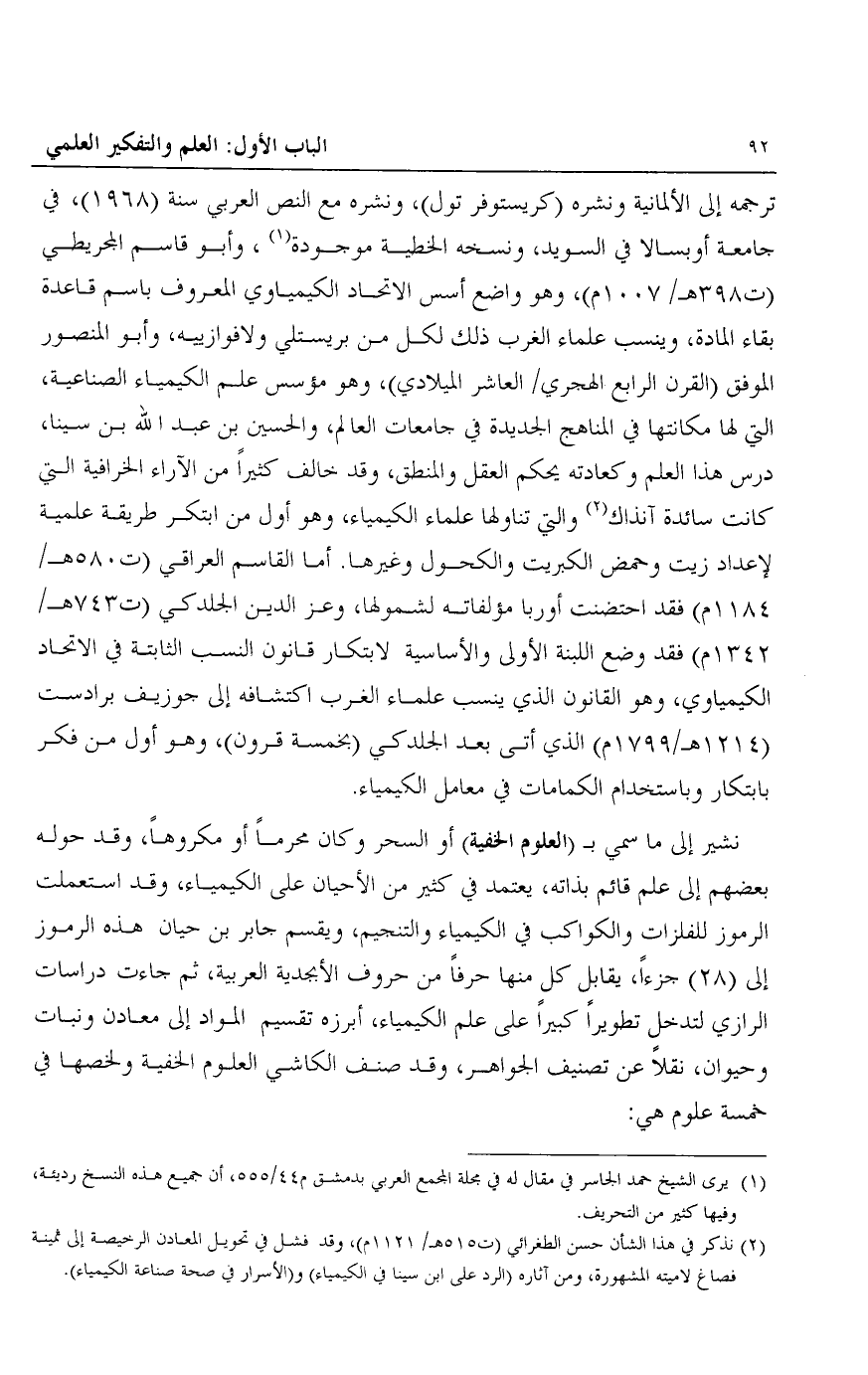ترجمة إلى الألمانية ونشره "كريستوفر تول"، ونشره مع النص العربي سنة "1986"، في جامعة أوبسالا في السويد، ونسخه الخطية موجودة1، وأبو قاسم المجريطي "ت 398هـ/ 1007م"، وهو واضع أسس الاتحاد الكيمياوي المعروف باسم قاعدة بقاء المادة، وينسب علماء الغرب ذلك لكل من بريستلي ولافوزييه، وأبو المنصور الموفق "القرن الرابع الهجري/ العاشر الميلادي"، وهو مؤسس علم الكيمياء الصناعية، التي لها مكانتها في المناهج الجديدة في جامعات العالم، والحسين بن عبد الله بن سينا، درس هذا العلم وكعادته يحكم العقل والمنطق، وقد خالف كثيرا من الآراء الخرافية التي كانت سائدة آنذاك2 والتي تناولها علماء الكيمياء، وهو أول من ابتكر طريقة علمية لإعداد زيت وحمض الكبريت والكحول وغيرها. أما القاسم العراقي "ت 580هـ/ 1184م" فقد احتضنت أوروبا مؤلفاته لشمولها، وعز الدين الجلدكي "ت 743هـ/ 1342م" فقد وضع اللبنة الأولى والأساسية لابتكار قانون النسب الثابتة في الاتحاد الكيمياوي، وهو القانون الذي ينسب علماء الغرب اكتشافه إلى جوزيف برادست "1214هـ/ 1799م" الذي أتى بعد الجلدكي "بخمسة قرون"، وهو أول من فكر بابتكار وباستخدام الكمامات في معامل الكيمياء.