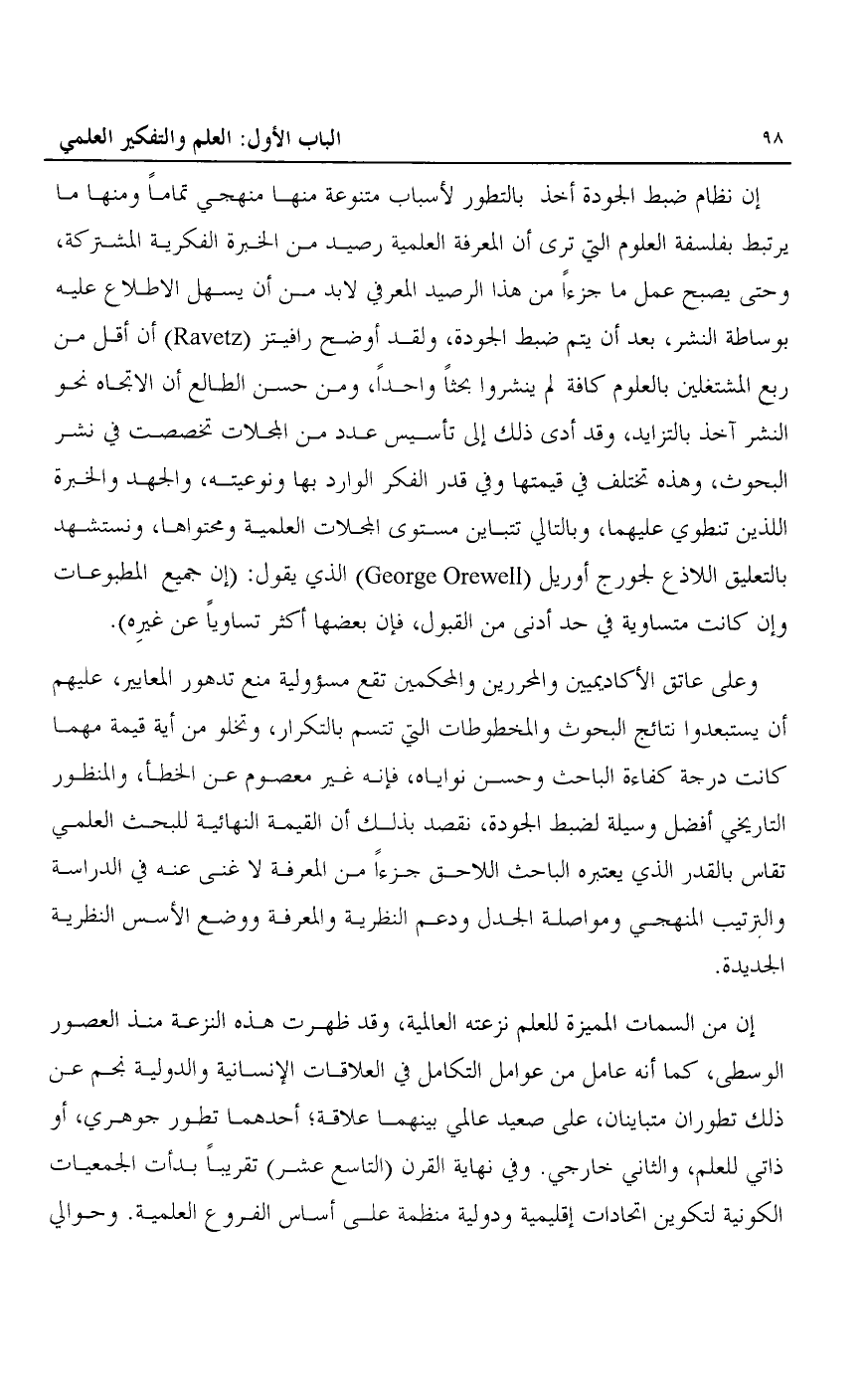 إن نظام ضبط الجودة أخذ بالتطور لأسباب متنوعة منها منهجي تماما ومنها ما يرتبط بفلسفة العلوم التي ترى أن المعرفة العلمية رصيد من الخبرة الفكرية المشتركة، وحتى يصبح عمل ما جزءا من هذا الرصيد المعرفي لا بد من أن يسهل الاطلاع عليه بوساطة النشر، بعد أن يتم ضبط الجودة، ولقد أوضح رافيتز "Ravets" أن أقل من ربع المشتغلين بالعلوم كافة لم ينشروا بحثا واحدا، ومن حسن الطالع أن الاتجاه نحو النشر آخذ بالتزايد، وقد أدى ذلك إلى تأسيس عدد من المجالات تخصصت في نشر البحوث، وهذه تختلف في قيمتها وفي قدر الفكر الوارد بها ونوعيته، والجهد والخبرة اللذين تنطوي عليهما، وبالتالي تتباين مستوى المجلات العلمية ومحتواها، ونستشهد بالتعليق اللاذع لجورج أوريل "Geoge Orewell" الذي يقول: "إن جميع المطبوعات وإن كانت متساوية في حد أدنى من القبول، فإن بعضها أكثر تساويا عن غيره".