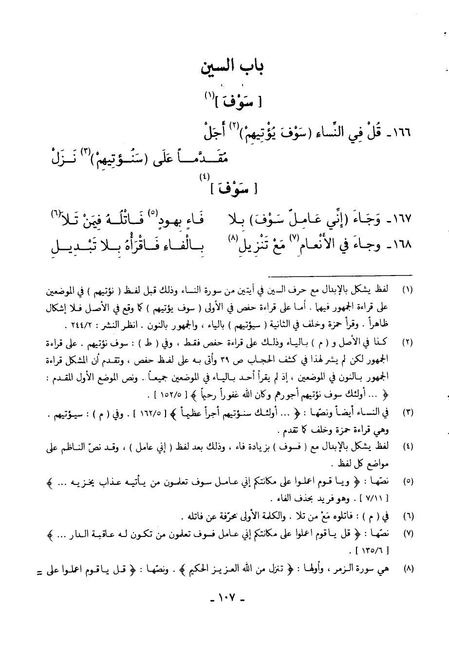 166 - قُلْ فِي النِّسَاءِ (سَوْفَ يُؤْتِيهِمْ) أَجَلْ ... مُقَدَّمًا عَلَى (سَنُؤْتِيهِمْ) نَزَلْ
