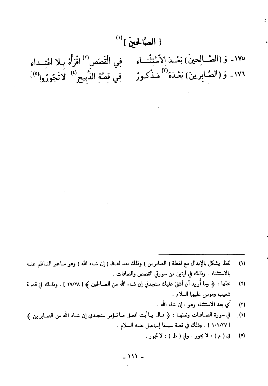 175 - وَ (الصَّالِحِينَ) بَعْدَ الاسْتِثْنَاءِ ... فِي الْقَصَصِ اقْرَأْهُ بِلا اعْتِدَاءِ