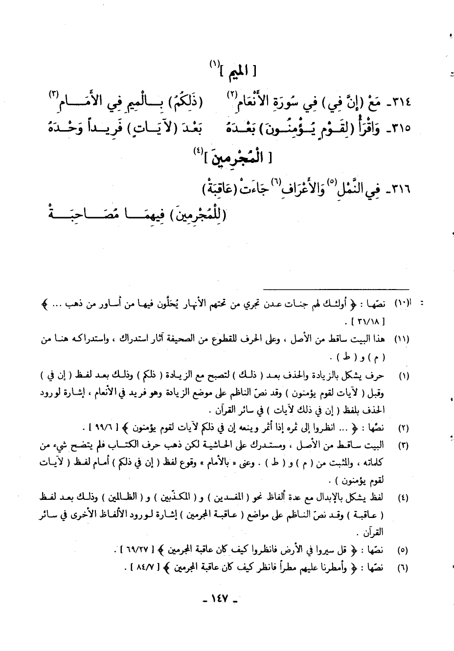 316 - فِي النَّمْلِ وَالأعْرَافِ جَاءَتْ (عَاقِبَةْ) ... (لِلْمُجْرِمِينَ) فِيهِمَا مُصَاحِبَةْ