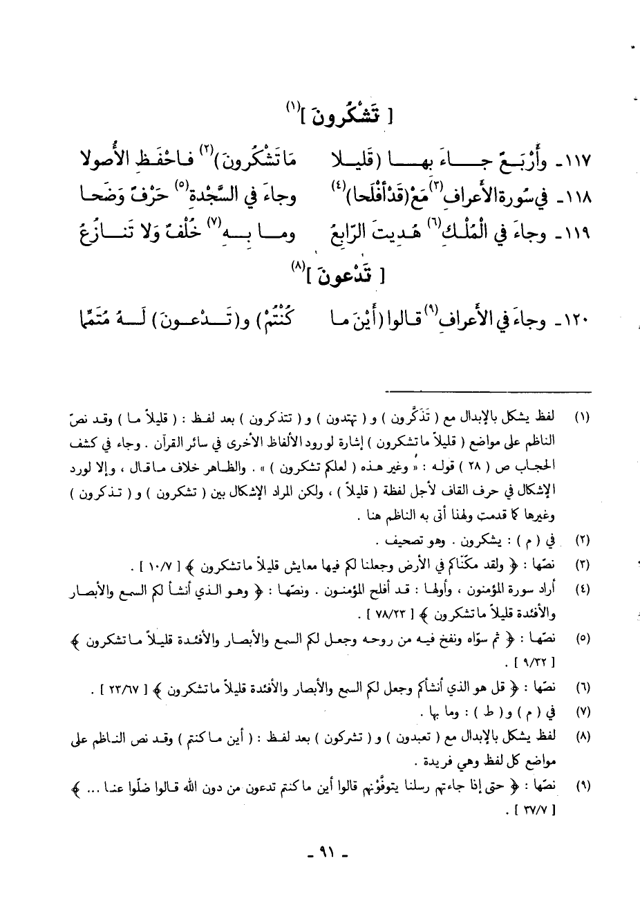 117 - وَأَرْبَعٌ جَاءَ بِهَا (قَلِيلا ... مَا تَشْكُرُونَ) فَاحْفَظِ الأُصُولا