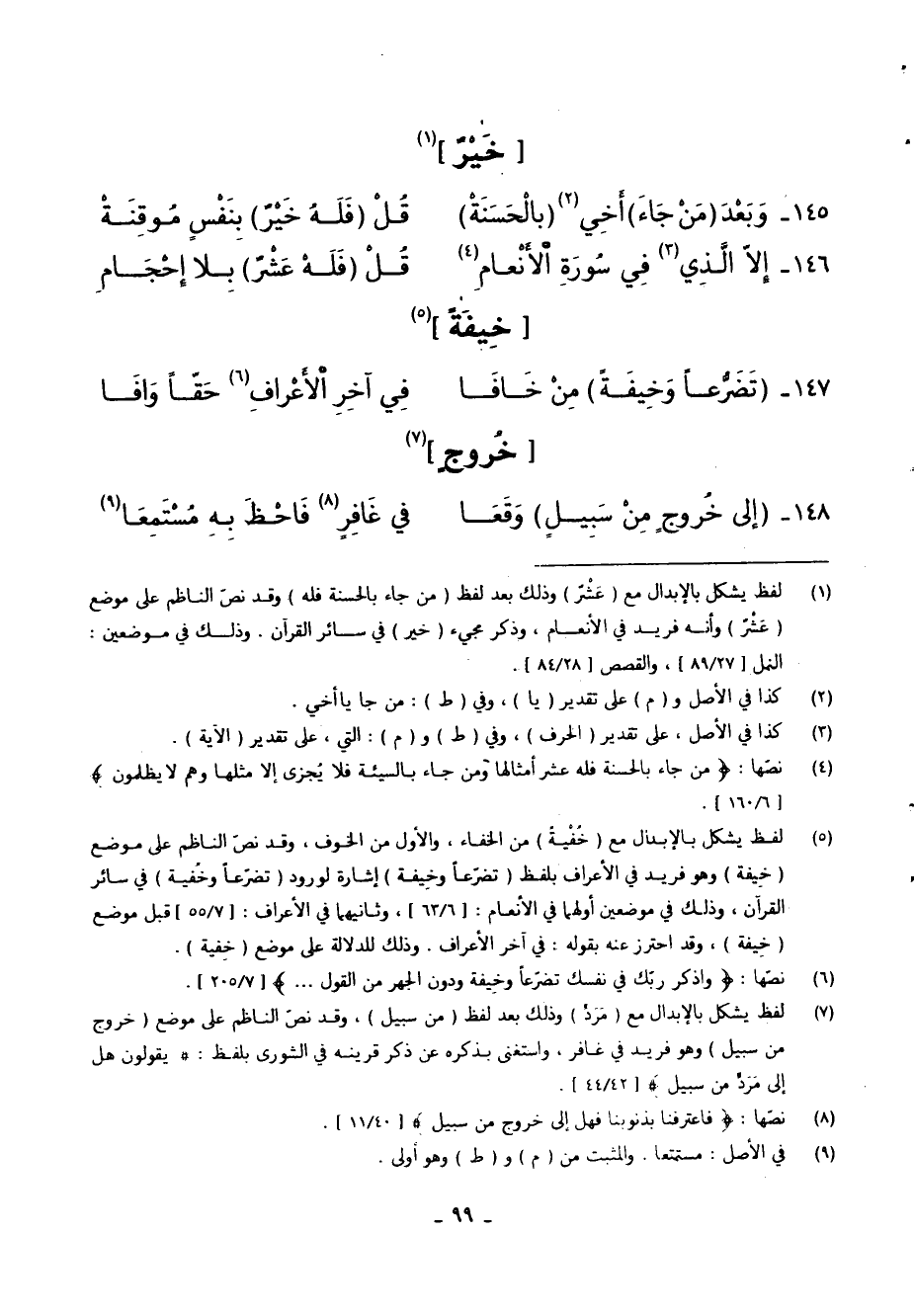147 - (تَضَرُّعًا وَخِيفَةً) مِنْ خَافَا ... فِي آخِرِ الأعْرَافِ حَقًّا وَافَا