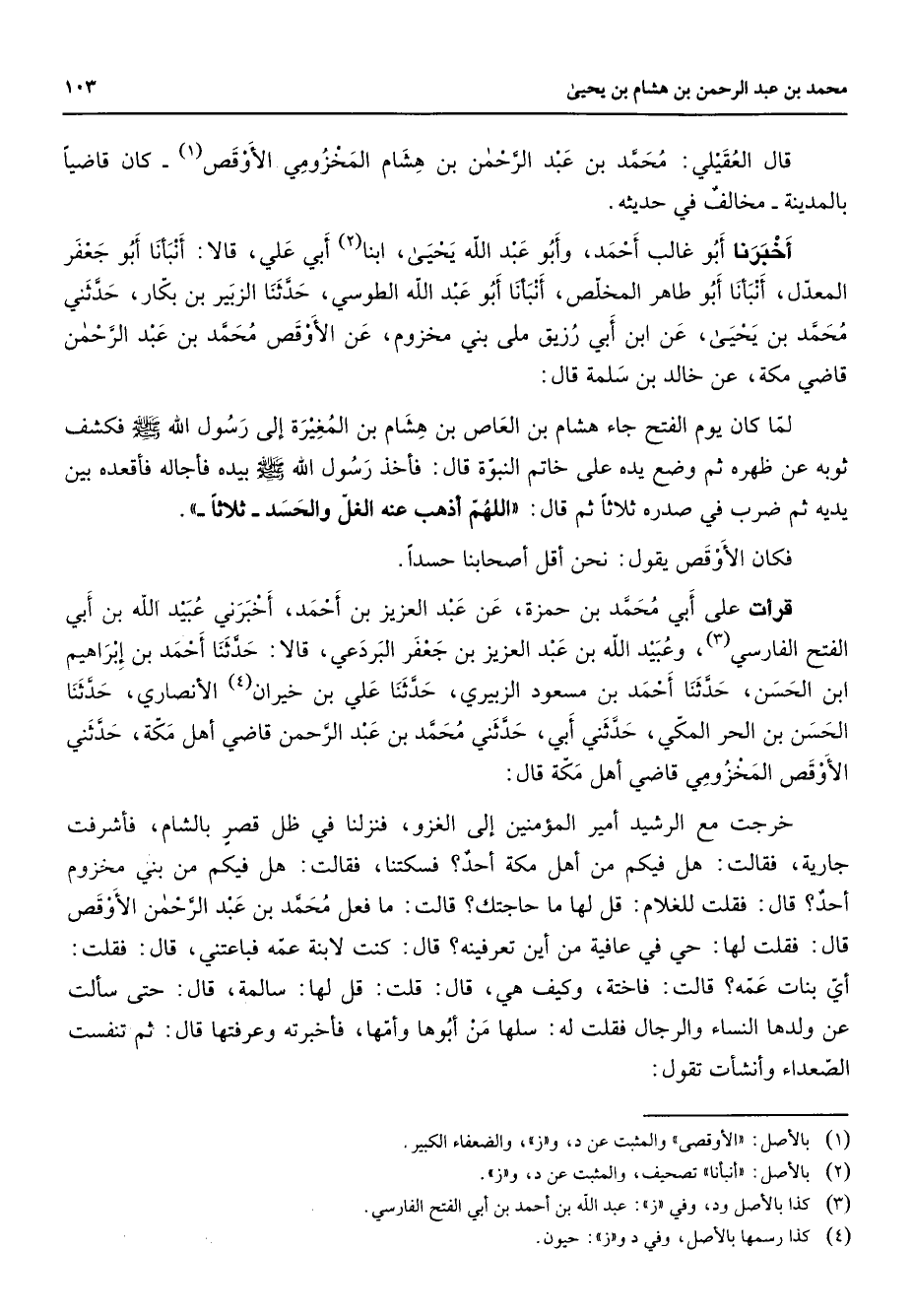 قال العقيلي محمد بن عبد الرحمن بن هشام المخزومي الأوقص (1) كان قاضيا بالمدينة مخالف في حديثه أخبرنا أبو غالب أحمد وأبو عبد الله يحيى ابنا (2) أبي علي قالا أنبأنا أبو جعفر المعدل أنبأنا أبو طاهر المخلص أنبأنا أبو عبد الله الطوسي حدثنا الزبير بن بكار حدثني محمد بن يحيى عن ابن أبي رزيق ملى بني مخزوم عن الأوقص محمد بن عبد الرحمن قاضي مكة عن خالد بن سلمة قال لما كان يوم الفتح جاء هشام بن العاص بن هشام بن المغيرة إلى رسول (صلى الله عليه وسلم) فكشف ثوبه عن ظهره ثم وضع يده على خاتم النبوة قال فأخذ رسول الله (صلى الله عليه وسلم) بيده فأجاله فأقعده بين يديه ثم ضرب في صدره ثلاثا ثم قال اللهم أذهب عنه الغل والحسد ثلاثا فكان الأوقص يقول نحن أقل أصحابنا حسدا قرأت على أبي محمد بن حمزة عن عبد العزيز بن أحمد أخبرني عبيد الله بن أبي الفتح الفارسي (3) وعبيد الله بن عبد العزيز بن جعفر البردعي قالا حدثنا أحمد بن إبراهيم ابن الحسن حدثنا أحمد بن مسعود الزبيري حدثنا علي بن خيران (4) الأنصاري حدثنا الحسن بن الحر المكي حدثني أبي حدثني محمد بن عبد الرحمن قاضي أهل مكة حدثني الأوقص المخزومي قاضي أهل مكة قال خرجت مع الرشيد أمير المؤمنين إلى الغزو فنزلنا في ظل قصر بالشام فأشرفت جارية فقالت هل فيكم من أهل مكة أحد فسكتنا فقالت هل فيكم من بني مخزوم أحد قال فقلت للغلام قل لها ما حاجتك قالت ما فعل محمد بن عبد الرحمن الأوقص قال فقلت لها حي في عافية من أين تعرفينه قال كنت لابنة عمه فباعتني قال فقلت أي بنات عمه قالت فاختة وكيف هي قال قلت قل لها سالمة قال حتى سألت عن ولدها النساء والرجال فقلت له سلها من أبوها وأمها فأخبرته وعرفتها قال ثم تنفست الصعداء وأنشأت تقول *
