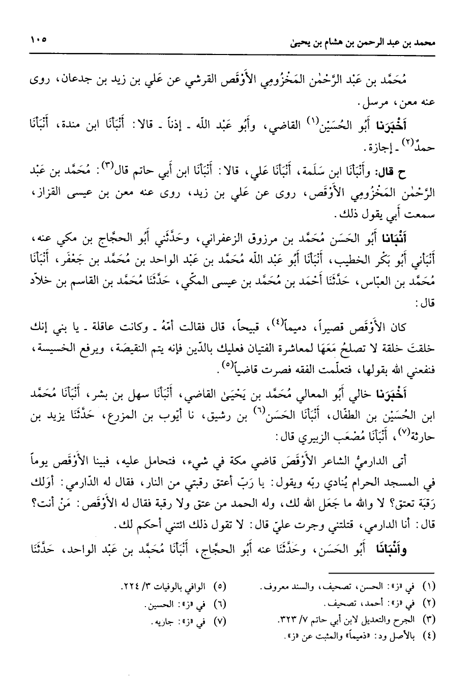 محمد بن عبد الرحمن المخزومي الأوقص القرشي عن علي بن زيد بن جدعان روى عنه معن مرسل أخبرنا أبو الحسين (1) القاضي وأبو عبد الله بإذنا قالا أنبأنا ابن مندة أنبأنا حمد (2) إجازة ح قال وأنبأنا ابن سلمة أنبأنا علي قالا أنبأنا ابن أبي حاتم قال (3) محمد بن عبد الرحمن المخزومي الأوقص روى عن علي بن زيد روى عنه معن بن عيسى القزاز سمعت أبي يقول ذلك أنبأنا أبو الحسن محمد بن مرزوق الزعفراني وحدثني أبو الحجاج بن مكي عنه أنبأني أبو بكر الخطيب أنبأنا أبو عبد الله محمد بن عبد الواحد بن محمد بن جعفر أنبأنا محمد بن العباس حدثنا أحمد بن محمد بن عيسى المكي حدثنا محمد بن القاسم بن خلاد قال كان الأوقص قصيرا دميما (4) قبيحا قال فقالت أمه وكان عاقلة يا بني إنك خلقت خلقة لا تصلح معها لمعاشرة الفتيان فعليك بالدين فإنه يتم النقيصة ويرفع الخسيسة فنفعني الله بقولها فتعلمت الفقه فصرت قاضيا (5) أخبرنا خالي أبو المعالي محمد بن يحيى القاضي أنبأنا سهل بن بشر أنبأنا محمد ابن الحسين بن الطفال أنبأنا الحسن (6) بن رشيق نا أيوب بن المزرع حدثنا يزيد بن حارثة (7) أنبأنا معصب الزبيري قال أتى الدرامي الشاعر الأوقص قاضي مكة في شئ فتحامل عليه فبينا الأوقص يوما في المسجد الحرام ينادي ربه ويقول يا رب أعتق رقبتي من النار فقال له الدارمي أو لك رقبة تعتق لا والله ما جعل الله لك وله الحمد من عتق ولا رقبة فقال له الأوقص من أنت قال أنا الدارمي قتلتني وجرت علي قال لا تقول ذلك ائتني أحكم لك وأنبأنا أبو الحسن وحدثنا عنه أبو الحجاج أنبأنا محمد بن عبد الواحد حدثنا