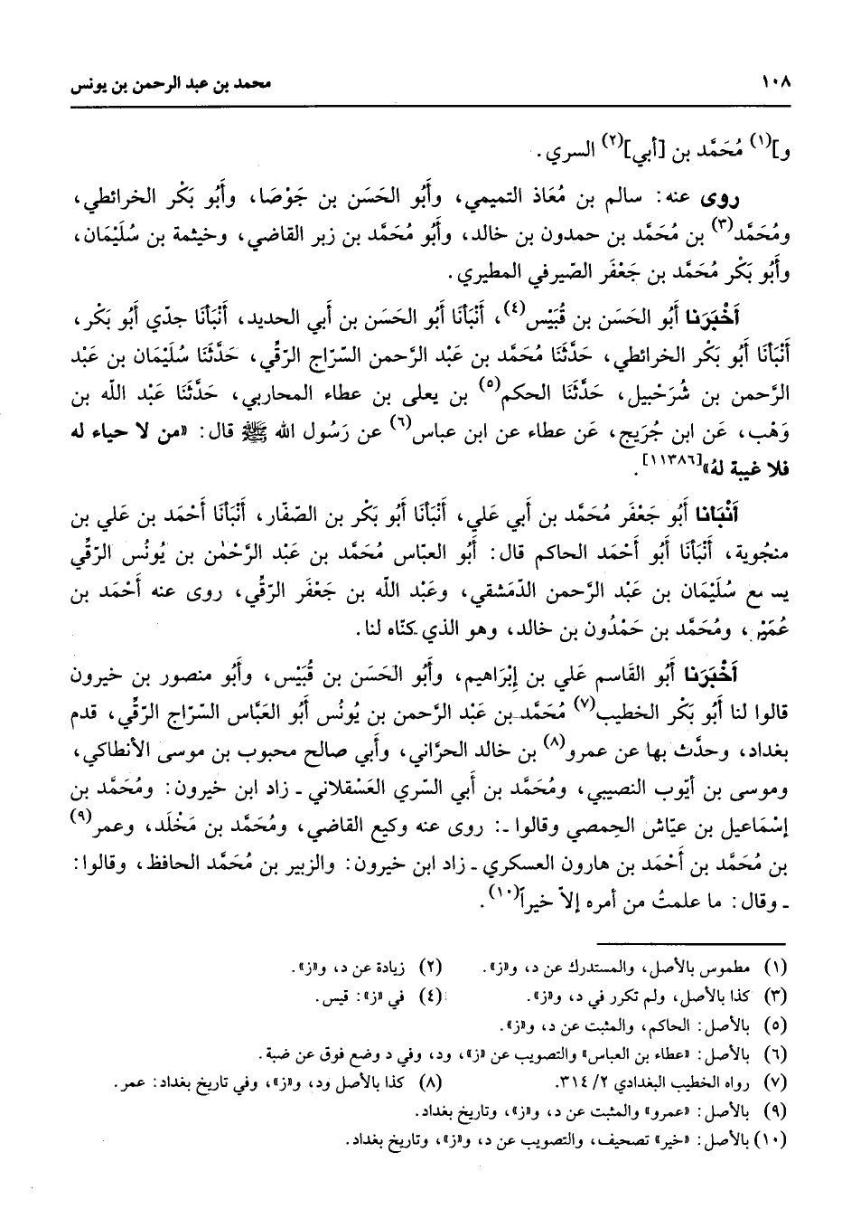 [11386] أنبأنا أبو جعفر محمد بن أبي علي أنبأنا أبو بكر بن الصفار أنبأنا أحمد بن علي بن منجوية أنبأنا أبو أحمد الحاكم قال أبو العباس محمد بن عبد الرحمن بن يونس الرقي يسمع سليمان بن عبد الرحمن الدمشقي وعبد الله بن جعفر الرقي روى عنه أحمد بن عمير ومحمد بن حمدون بن خالد وهو الذي كناه لنا أخبرنا أبو القاسم علي بن إبراهيم وأبو الحسن بن قبيس وأبو منصور بن خيرون قالوا لنا أبو بكر الخطيب (7) محمد بن عبد الرحمن بن يونس أبو العباس السراج الرقي قدم بغداد وحدث بها عن عمرو (8) بن خالد الحراني وأبي صالح محبوب بن موسى الأنطاكي وموسى بن أيوب النصيبي ومحمد بن أبي السري العسقلاني زاد ابن خيرون ومحمد بن إسماعيل بن عياش الحمصي وقالوا روى عنه وكيع القاضي ومحمد بن مخلد وعمر (9) بن محمد بن أحمد بن هارون العسكري زاد ابن خيرون والزبير بن محمد الحافظ وقالوا وقال ما علمت من أمره إلا خيرا (10)