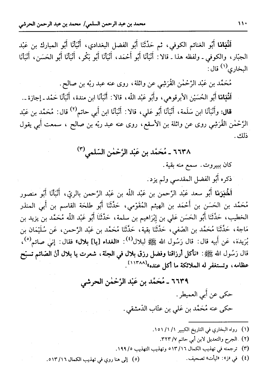 أنبأنا أبو الغنائم الكوفي ثم حدثنا أبو الفضل البغدادي أنبأنا أبو المبارك بن عبد الجبار والكوفي ولفظه هذا قالا أنبأنا أبو أحمد أنبأنا أبو بكر أنبأنا أبو الحسن أنبأنا البخاري (1) قال محمد بن عبد الرحمن القرشي عن واثلة روى عنه عبد ربه بن صالح أنبأنا أبو الحسين الأبرقوهي وأبو عبد الله قالا أنبأنا ابن مندة أنبأنا حمد إجازة قال وأنبأنا ابن سلمة أنبأنا أبو علي قالا أنبأنا ابن أبي حاتم (2) قال محمد بن عبد الرحمن القرشي روى عن واثلة بن الأسقع روى عنه عبد ربه بن صالح سمعت أبي يقول ذلك
