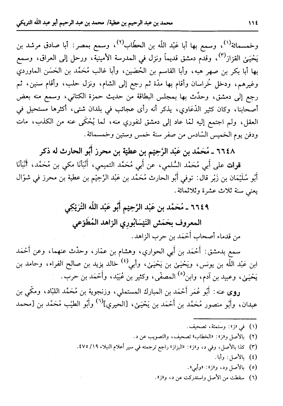 6649 - محمد بن عبد الرحيم أبو عبد الله التريكي المعروف بحمش النيسابوري الزاهد المطوعي من قدماء أصحاب أحمد بن حرب الزاهد سمع بدمشق أحمد بن أبي الحواري وهشام بن عمار وحدث عنهما وعن أحمد ابن عبد الله بن يونس ويحيى بن يحيى وأبي (4) خالد يزيد بن صالح الفراء وحامد بن يحيى وعبيد بن آدم وابن (5) المصفى وكثير بن عبيد وأحمد بن حرب روى عنه أبو عمر أحمد بن المبارك المستملي وزنجوية بن محمد اللباد ومكي بن عبدان وأبو منصور محمد بن أحمد بن يحيى الحيري (6) وأبو الطيب محمد بن محمد