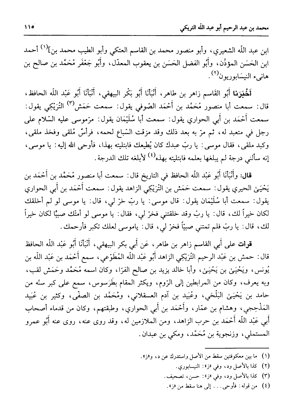 ابن عبد الله الشعيري وأبو منصور محمد بن القاسم العتكي وأبو الطيب محمد بن (1) أحمد ابن الحسن المؤذن وأبو الفضل الحسن بن يعقوب المعدل وأبو جعفر محمد بن صالح بن هانئ النيسابورين (2) أخبرنا أبو القاسم زاهر بن طاهر أنبأنا أبو بكر البيهقي أنبأنا أبو عبد الله الحافظ قال سمعت أبا منصور محمد بن أحمد الصوفي يقول سمعت حمش (3) التريكي يقول سمعت أحمد بن أبي الحواري يقول سمعت أبا سليمان يقول مر موسى عليه السلام على رجل في متعبد له ثم مر به بعد ذلك وقد مزقت السباع لحمه فرأس ملقى وفخذ ملقى وكبد ملقى فقال موسى يا رب عبدك كان يطيعك فابتليته بهذا فأوحى الله إليه يا موسى إنه سألني درجة لم يبلغها بعلمه فابتليته بهذه (4) لأبلغه تلك الدرجة قال وأنبأنا أبو عبد الله الحافظ في التاريخ قال سمعت أبا منصور محمد بن أحمد بن يحيى الحيري يقول سمعت حمش بن التريكي الزاهد يقول سمعت أحمد بن أبي الحواري يقول سمعت أبا سليمان يقول قال موسى يا رب خر لي قال يا موسى لو لم أخلقك لكان خيرا لك قال يا رب وقد خلقتني فخر لي فقال يا موسى لو أمتك صبيا لكان خيرا لك قال يا رب فلم تمتني صبيا فخر لي قال يا موسى لعلك تكبر فأرحمك قرأت على أبي القاسم زاهر بن طاهر عن أبي بكر البيهقي أنبأنا أبو عبد الله الحافظ قال حمش بن عبد الرحيم التريكي الزاهد أبو عبد الله المطوعي سمع أحمد بن عبد الله بن يونس ويحيى بن يحيى وأبا خالد يزيد بن صالح الفرا وكان اسمه محمد وحمش لقب وبه يعرف وكان من المرابطين إلى الروم ويكثر المقام بطرسوس سمع على كبر سنه من حامد بن يحيى البلخي وعبيد بن آدم العسقلاني ومحمد بن الصفى وكثير بن عبيد المذحجي وهشام بن عمار وأحمد بن أبي الحواري وطبقتهم وكان من قدماء أصحاب أبي عبد الله أحمد بن حرب الزاهد ومن الملازمين له وقد روى عنه روى عنه أبو عمرو المستملي وزنجوية بن محمد ومكي بن عبدان