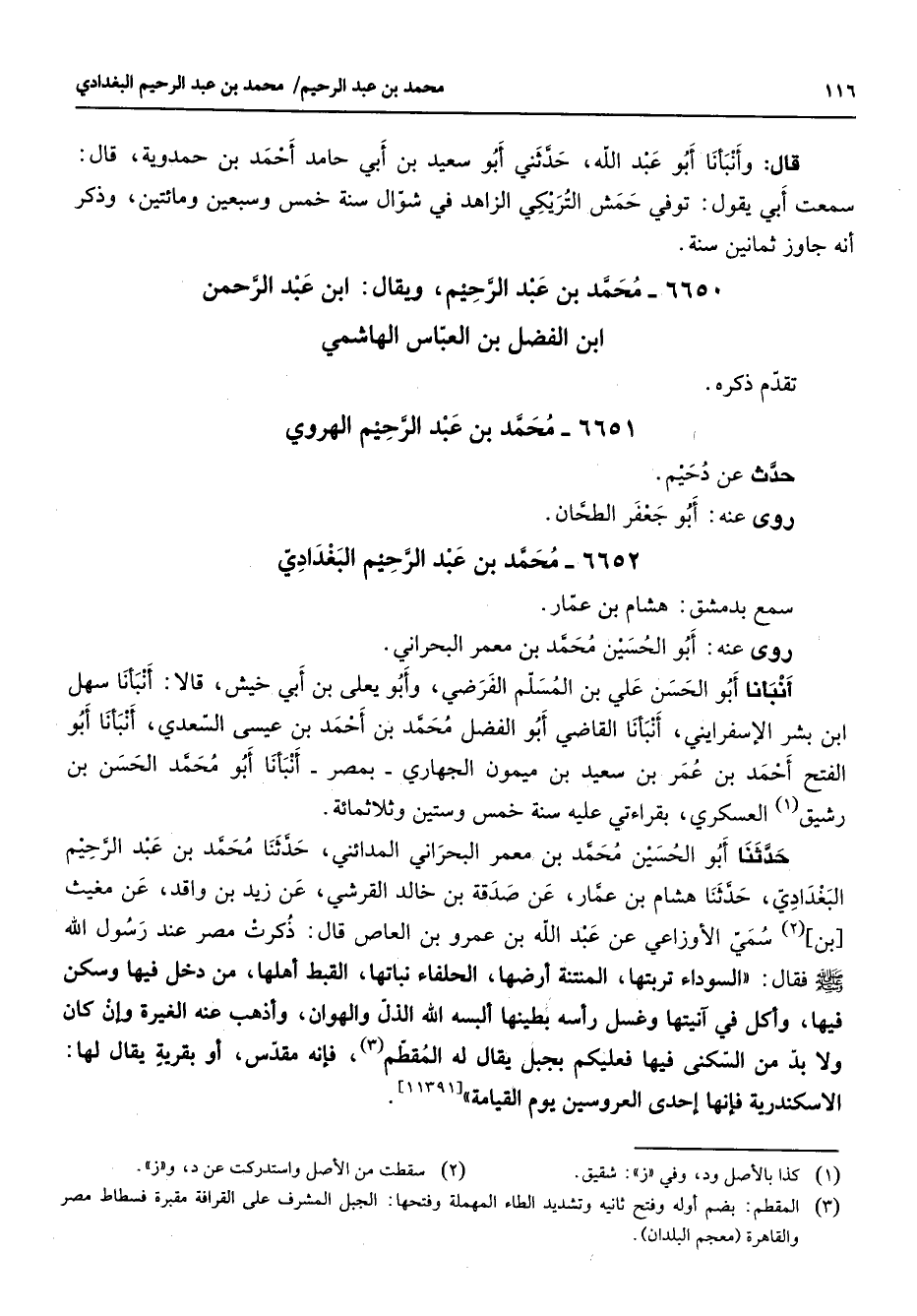 6652 - محمد بن عبد الرحيم البغدادي سمع بدمشق هشام بن عمار روى عنه أبو الحسين محمد بن معمر البحراني أنبأنا أبو الحسن علي بن المسلم الفرضي وأبو يعلى بن أبي خيش قالا أنبأنا سهل ابن بشر الإسفرايني أنبأنا القاضي أبو الفضل محمد بن أحمد بن عيسى السعدي أنبأنا أبو الفتح أحمد بن عمر بن سعيد بن ميمون الجهاري بمصر أنبأنا أبو محمد الحسن بن رشيق (1) العسكري بقراءتي عليه سنة خمس وستين وثلاثمائة حدثنا أبو الحسين محمد بن معمر البحراني المدائني حدثنا محمد بن عبد الرحيم البغدادي حدثنا هشام بن عمار عن صدقة بن خالد القرشي عن زيد بن واقد عن مغيث بن (2) سمي الأوزاعي عن عبد الله بن عمرو بن العاص قال ذكرت مصر عند رسول الله (صلى الله عليه وسلم) فقال السوداء تربتها المنتنة أرضها الحلفاء نباتها القبط أهلها من دخل فيها وسكن فيها وأكل في آنيتها وغسل رأسه بطينها ألبسه الله الذل والهوان وأذهب عنه الغيرة وإن كان ولا بد من السكنى فيها فعليكم بجبل يقال له المقطم (3) فإنه مقدس أو بقرية يقال لها الاسكندرية فإنها إحدى العروسين يوم القيامة