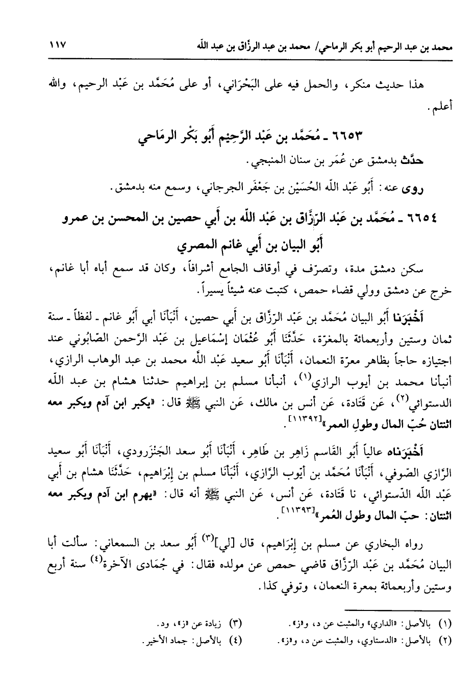 6654 - محمد بن عبد الرزاق بن عبد الله بن أبي حصين بن المحسن بن عمرو أبو البيان بن أبي غانم المصري سكن دمشق مدة وتصرف في أوقاف الجامع أشرافا وكان قد سمع أباه أبا غانم خرج عن دمشق وولي قضاء حمص كتبت عنه شيئا يسيرا أخبرنا أبو البيان محمد بن عبد الرزاق بن أبي حصين أنبأنا أبي أبو غانم لفظا سنة ثمان وستين وأربعمائة بالمغرة حدثنا أبو عثمان إسماعيل بن عبد الرحمن الصابوني عند اجتيازه حاجا بظاهر معرة النعمان أنبأنا أبو سعيد عبد الله محمد بن عبد الوهاب الرازي أنبأنا محمد بن أيوب الرازي (1) أنبأنا مسلم بن إبراهيم حدثنا هشام بن عبد الله الدستوائي (2) عن قتادة عن أنس بن مالك عن النبي (صلى الله عليه وسلم) قال يكبر ابن آدم ويكبر معه اثنتان حب المال وطول العمر