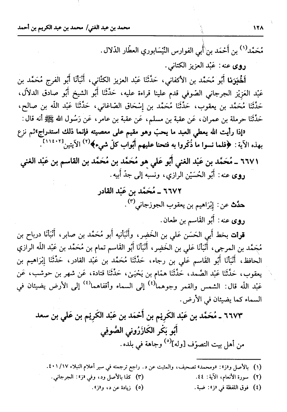 6671 - محمد بن عبد الغني أبو علي هو محمد بن محمد بن القاسم بن عبد الغني روى عنه أبو الحسين الرازي ونسبه إلى جد أبيه