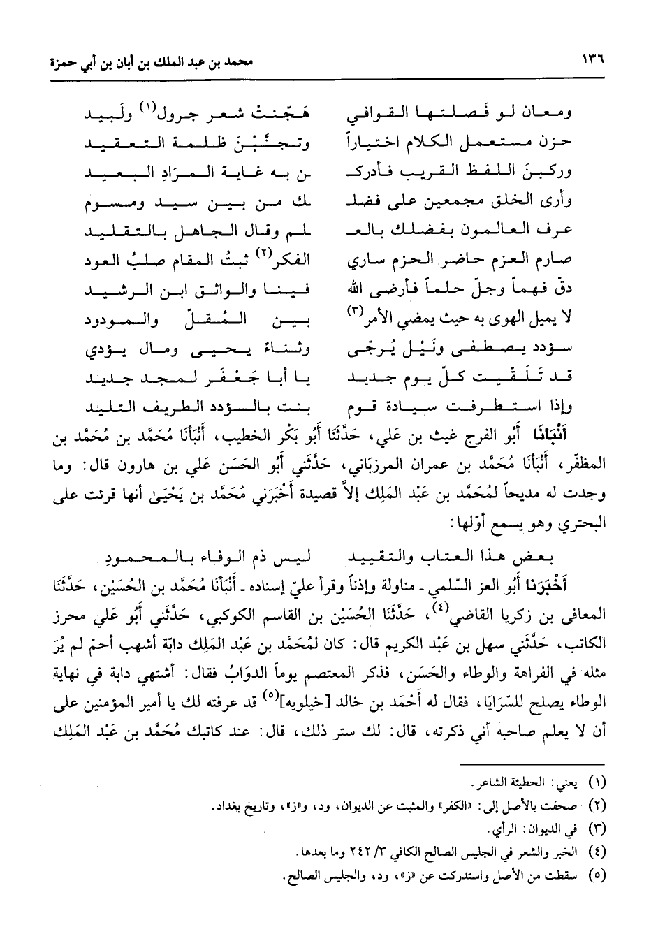 ومعان لو فصلتها القوافي * هجنت شعر جرول (1) ولبيد حزن مستعمل الكلام اختيارا * وتجنبن ظلمة التعقيد وركبن اللفظ القريب فأدرك * ن به غاية المراد البعيد وأرى الخلق مجمعين على فضل * ك من بين سيد ومسوم عرف العالمون بفضلك بالع * لم وقال الجاهل بالتقليد صارم العزم حاضر الحزم ساري * الفكر (2) ثبت المقام صلب العود دق فهما وجل حلما فأرضي الله * فينا والواثق ابن الرشيد لا يميل الهوى به حيث يمضي الأمر (3) * بين المقل والمودود سؤدد يصطفى ونيل يرجى * وثناء يحيى ومال يؤدي قد تلقيت كل يوم جديد * يا أبا جعفر لمجد جديد وإذا استطرفت سيادة قوم * بنت بالسؤدد الطريف التليد * أنبأنا أبو الفرج غيث بن علي حدثنا أبو بكر الخطيب أنبأنا محمد بن محمد بن المظفر أنبأنا محمد بن عمران المرزباني حدثني أبو الحسن علي بن هارون قال وما وجدت له مديحا لمحمد بن عبد الملك إلا قصيدة أخبرني محمد بن يحيى أنها قرئت على البحتري وهو يسمع أولها * بعض هذا العتاب والتقييد * ليس ذم الوفاء بالمحمود * أخبرنا أبو العز السلمي مناولة وإذنا وقرأ علي إسناده أنبأنا محمد بن الحسين حدثنا المعافى بن زكريا القاضي (4) حدثنا الحسين بن القاسم الكوكبي حدثني أبو علي محرز الكاتب حدثني سهل بن عبد الكريم قال كان لمحمد بن عبد الملك دابة لم ير أحم لم ير مثله في الفراهة والوطاء والحسن فذكر المعتصم يوم الدواب فقال أشتهى دابة في نهاية الوطاء يصلح للسرايا فقال له أحمد بن خالد خيلويه (5) قد عرفته لك يا أمير المؤمنين على أن لا يعلم صاحبه أني ذكرته قال لك ستر ذلك قال عند كاتبك محمد بن عبد الملك