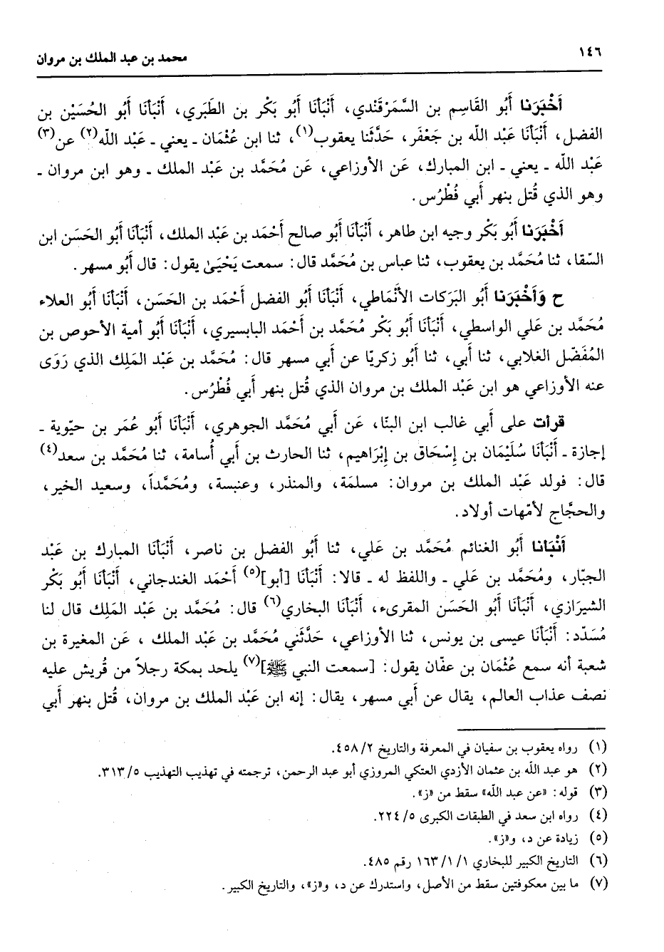 أخبرنا أبو القاسم بن السمرقندي أنبأنا أبو بكر بن الطبري أنبأنا أبو الحسين بن الفضل أنبأنا أبو عبد الله بن جعفر حدثنا يعقوب (1) ثنا ابن عثمان يعني عبد الله (2) عن (3) عبد الله يعني ابن المبارك عن الأوزاعي عن محمد بن عبد الملك وهو ابن مروان وهو الذي قتل بنهر أبي فطرس أخبرنا أبو بكر وجيه ابن طاهر أنبأنا أبو صالح أحمد بن عبد الملك أنبأنا أبو الحسن ابن السقا ثنا محمد بن يعقوب ثنا عباس بن محمد قال سمعت يحيى يقول قال أبو مسهر ح وأخبرنا أبو البركات الأنماطي أنبأنا أبو الفضل أحمد بن الحسن أنبأنا أبو العلاء محمد بن علي الواسطي أنبأنا أبو بكر محمد بن أحمد البابسيري أنبأنا أبو أمية الأحوص بن المفضل الغلابي ثنا أبي ثنا أبو زكريا عن أبي مسهر قال محمد بن عبد الملك الذي روى عنه الأوزاعي هو ابن عبد الملك بن مروان الذي قتل بنهر أبي فطرس قرأت على أبي غالب ابن البنا عن أبي محمد الجوهري أنبأنا أبو عمر بن حيوية إجازة أنبأنا سليمان بن إسحاق بن إبراهيم ثنا الحارث بن أبي أسامة ثنا محمد بن سعد (4) قال فولد عبد الملك بن مروان مسلمة والمنذر وعنبسة ومحمدا وسعيد الخير والحجاج لأمهات أولاد أنبأنا أبو الغنائم محمد بن علي ثنا أبو الفضل بن ناصر أنبأنا المبارك بن عبد الجبار ومحمد بن علي واللفظ له قالا أنبأنا أبو (5) أحمد الغندجاني أنبأنا أبو بكر الشيرازي أنبأنا أبو الحسن المقرئ أنبأنا البخاري (6) قال محمد بن عبد الملك قال لنا مسدد أنبأنا عيسى بن يونس ثنا الأوزاعي حدثني محمد بن عبد الملك عن المغيرة بن شعبة أنه سمع عثمان بن عفان يقول سمعت النبي (صلى الله عليه وسلم) (7) يلحد بمكة رجلا من قريش عليه نصف عذاب العالم يقال عن أبي مسهر يقال إنه ابن عبد الملك بن مروان قتل بنهر أبي