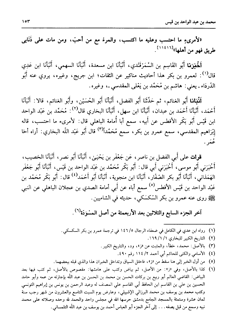 [11416] أخبرنا أبو القاسم بن السمرقندي أنبأنا ابن مسعدة أنبأنا السهمي أنبأنا ابن عدي قال (1) لعمرو بن بكر هذا أحاديث مناكير عن الثقات ابن جريج وغيره يروي عنه أبو الدرداء يعني هاشم بن محمد بن يعلى المقدسي وغيره أنبأنا أبو الغنائم ثم حدثنا أبو الفضل أنبأنا أبو الحسين وأبو الغنائم قالا أنبأنا أحمد أنبأنا أحمد بن عبدان أنبأنا ابن سهل أنبأنا البخاري قال (2) محمد بن عبد الواحد ابن قيس أبو بكر الأفطس عن أبيه سمع أبا أمامة الباهلي قال لأمرئ ما احتسب قاله إبراهيم المقدسي سمع عمرو بن بكر سمع محمدا (3) قال أبو عبد الله البخاري أراه أخا عمر قرأت على أبي الفضل بن ناصر عن جعفر بن يحيى أنبأنا أبو نصر أنبأنا الخصيب أخبرني أبو موسى أخبرني أبي قال أبو بكر محمد بن عبد الواحد بن قيس أنبأنا أبو جعفر الهمذاني أنبأنا أبو بكر الصفار أنبأنا ابن منجوية أنبأنا أبو أحمد (4) قال أبو بكر محمد بن عبد الواحد بن قيس الأفطس (5) سمع أباه عن أبي أمامة الصدي بن عجلان الباهلي عن النبي (صلى الله عليه وسلم) روى عنه عمرو بن بكر السكسكي حديثه في الشاميين آخر الجزء السابع والثلاثين بعد الأربعمئة من أصل المسودة (6)