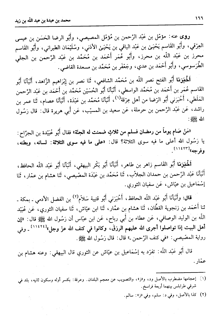 روى عنه مؤمل بن عبد الرحمن بن مؤمل المصيصي وأبو الرضا الحسن بن عيسى العرقي وأبو القاسم يحيى بن عبد الباقي بن يحيى الأذني وسليمان الطبراني وأبو القاسم محرز بن عبد الله بن محرز وأبو عمر أحمد بن محمد بن عبد الرحمن بن الجلي الطرسوسي وأبو أحمد بن عدي وجعفر بن محمد بن مسعدة القاضي أخبرنا أبو الفتح نصر الله بن محمد الشافعي ثنا نصر بن إبراهيم الزاهد أنبأنا أبو القاسم عمر بن أحمد بن محمد الواسطي أنبأنا أبو الحسين محمد بن أحمد بن عبد الرحمن الملطي أخبرني أبو الرضا من أهل عرقة (1) أنبأنا محمد بن عبدة أنبأنا عصام ثنا عمر بن راشد عن عبد الرحمن بن حرملة عن سعيد بن المسيب عن أبي هريرة قال قال رسول الله (صلى الله عليه وسلم) من صام يوما من رمضان فسلم من ثلاث ضمنت له الجنة فقال أبو عبيدة بن الجراح يا رسول الله أعلى ما فيه سوى الثلاثة قال على ما فيه سوى الثلاثة لسانه وبطنه وفرجه