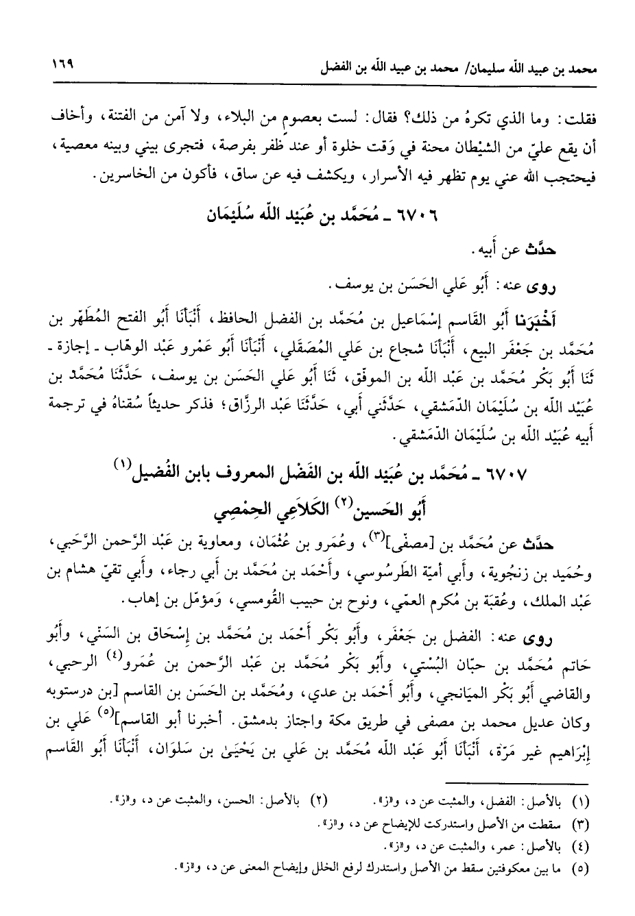 6707 - محمد بن عبيد الله بن الفضل المعروف بابن الفضيل (1) أبو الحسين (2) الكلاعي الحمصي حدث عن محمد بن مصفى (3) وعمرو بن عثمان ومعاوية بن عبد الرحمن الرحبي وحميد بن زنجوية وأبي أمية الطرسوسي وأحمد بن محمد بن أبي رجاء وأبي تقي هشام بن عبد الملك وعقبة بن مكرم العمي ونوح بن حبيب القومسي ومؤمل بن إهاب روى عنه الفضل بن جعفر وأبو بكر أحمد بن محمد بن إسحاق بن السني وأبو حاتم محمد بن حبان البستي وأبو بكر محمد بن عبد الرحمن بن عمرو (4) الرحبي والقاضي أبو بكر الميانجي وأبو أحمد بن عدي ومحمد بن الحسن بن القاسم بن درستوبه وكان عديل محمد بن مصفى في طريق مكة واجتاز بدمشق أخبرنا أبو القاسم (5) علي بن إبراهيم غير مرة أنبأنا أبو عبد الله محمد بن علي بن يحيى بن سلوان أنبأنا أبو القاسم