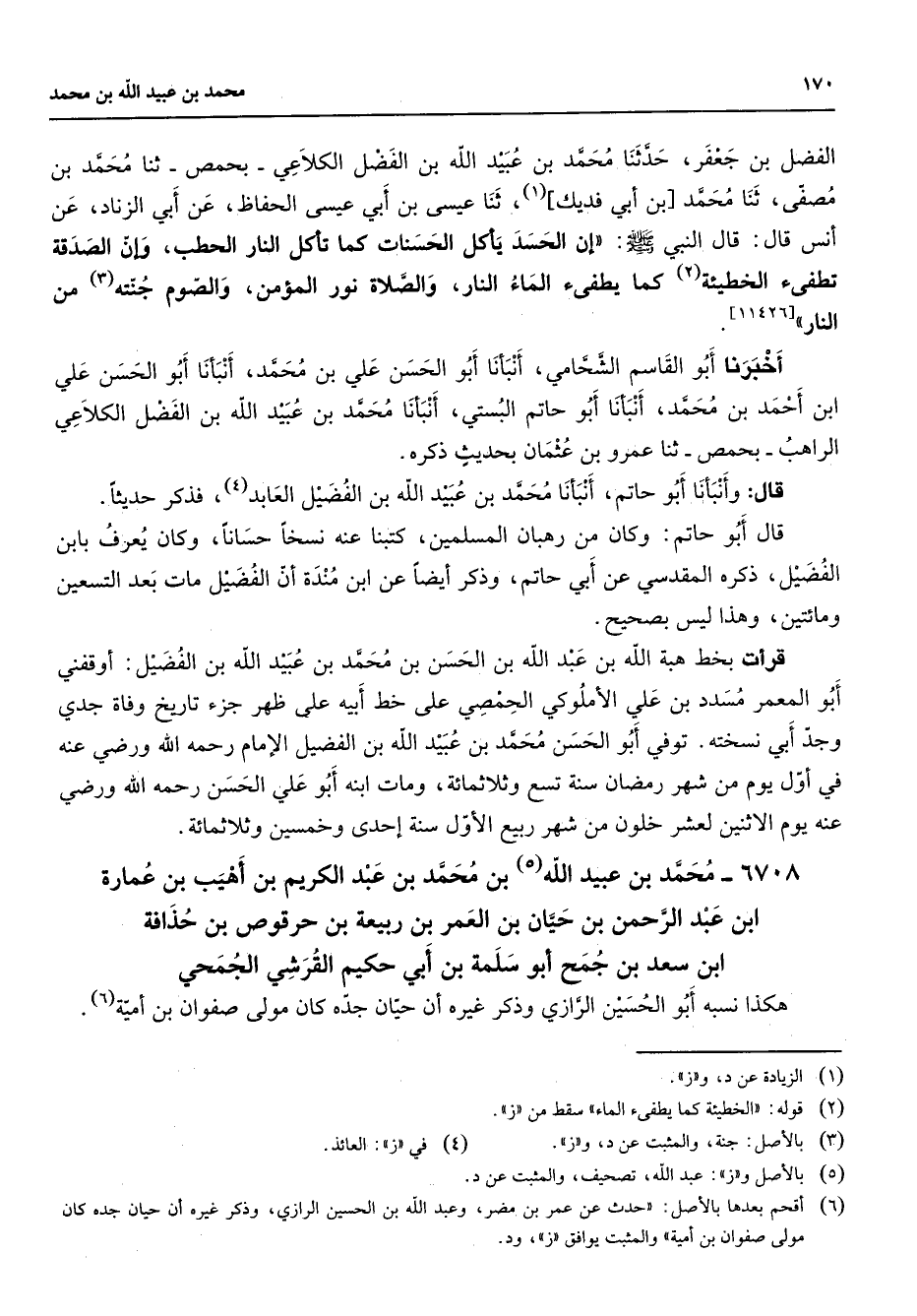 الفضل بن جعفر حدثنا محمد بن عبيد الله بن الفضل الكلاعي بحمص ثنا محمد بن مصفى ثنا محمد بن أبي فديك (1) ثنا عيسى بن أبي عيسى الحفاظ عن أبي الزناد عن أنس قال قال النبي (صلى الله عليه وسلم) إن الحسد يأكل الحسنات كما تأكل النار الحطب وإن الصدقة تطفئ الخطيئة (2) كما يطفئ الماء النار والصلاة نور المؤمن والصوم جنته (3) من النار