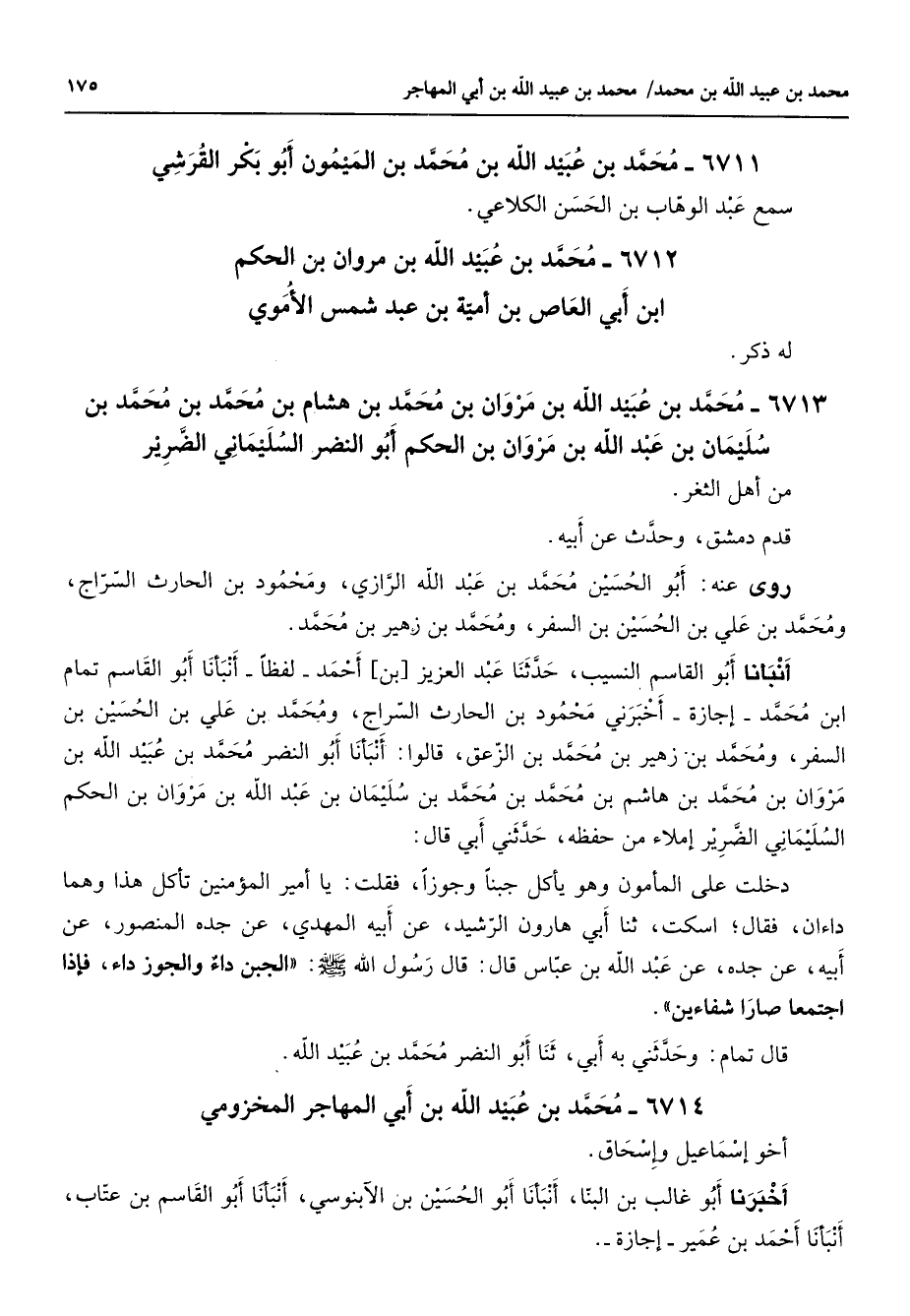 6713 - محمد بن عبيد الله بن مروان بن محمد بن هشام بن محمد بن محمد بن سليمان بن عبد الله بن مروان بن الحكم أبو النضر السليماني الضرير من أهل الثغر قدم دمشق وحدث عن أبيه روى عنه أبو الحسين محمد بن عبد الله الرازي ومحمود بن الحارث السراج ومحمد بن علي بن الحسين بن السفر ومحمد بن زهير بن محمد أنبأنا أبو القاسم النسيب حدثنا عبد العزيز بن أحمد لفظا أنبأنا أبو القاسم تمام ابن محمد إجازة أخبرني محمود بن الحارث السراج ومحمد بن علي بن الحسين بن السفر ومحمد بن زهير بن محمد بن الزعق قالوا أنبأنا أبو النضر محمد بن عبيد الله بن مروان بن محمد بن هاشم بن محمد بن محمد بن سليمان بن عبد الله بن مروان بن الحكم السليماني الضرير إملاء من حفظه حدثني أبي قال دخلت على المأمون وهو يأكل جبنا وجوزا فقلت يا أمير المؤمنين تأكل هذا وهما داءان فقال اسكت ثنا أبي هارون الرشيد عن أبيه المهدي عن جده المنصور عن أبيه عن جده عن عبد الله بن عباس قال قال رسول الله (صلى الله عليه وسلم) الجبن داء والجوز داء فإذا اجتمعا صارا شفاءين قال تمام وحدثني به أبي ثنا أبو النضر محمد بن عبيد الله