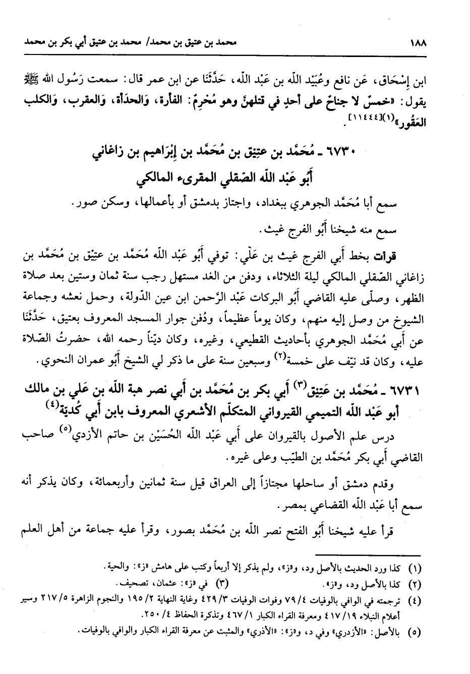 6730 - محمد بن عتيق بن محمد بن إبراهيم بن زاغاني أبو عبد الله الصقلي المقرئ المالكي سمع أبا محمد الجوهري ببغداد واجتاز بدمشق أو بأعمالها وسكن صور سمع منه شيخنا أبو الفرج غيث قرأت بخط أبي الفرج غيث بن علي توفي أبو عبد الله محمد بن عتيق بن محمد بن زاغاني الصقلي المالكي ليلة الثلاثاء ودفن من الغد مستهل رجب سنة ثمان وستين بعد صلاة الظهر وصلى عليه القاضي أبو البركات عبد الرحمن ابن عين الدولة وحمل نعشه وجماعة الشيوخ من وصل إليه منهم وكان يوما عظيما ودفن جوار المسجد المعروف بعتيق حدثنا عن أبي محمد الجوهري بأحاديث القطيعي وغيره وكان دينا رحمه الله حضرت الصلاة عليه وكان قد نيف على خمسة (2) وسبعين سنة على ما ذكر لي الشيخ أبو عمران النحوي