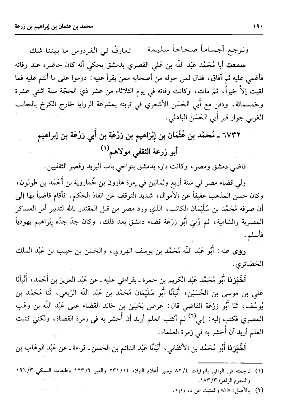 6732 - محمد بن عثمان بن إبراهيم بن زرعة بن أبي زرعة بن إبراهيم أبو زرعة الثقفي مولاهم (1) قاضي دمشق ومصر وكانت داره بدمشق بنواحي باب البريد وقصر الثقفيين ولي قضاء مصر في سنة أربع وثمانين في إمرة هارون بن خماروية بن أحمد بن طولون وكان حسن المذهب عفيفا عن الأموال شديد التوقف عن انفاذ الحكم فأقام قاضيا بها إلى أنص أن صرفه محمد بن سليمان الكاتب الذي ورد مصر من قبل المقتدر بالله لتدبير أمر العساكر المصرية والشامية ثم ولي أبو زرعة قضاء دمشق بعد ذلك وكان جد جده إبراهيم يهوديا فأسلم روى عنه أبو عبد الله محمد بن يوسف الهروي والحسن بن حبيب بن عبد الملك الحصائري أخبرنا أبو محمد عبد الكريم بن حمزة بقراءتي عليه عن عبد العزيز بن أحمد أنبأنا علي بن موسى بن الحسين أنبأنا أبو سليمان محمد بن عبد الله الربعي ثنا محمد بن يوسف ثنا أبو زرعة القاضي قال عرض يحيى بن خالد القضاء على عبد الله بن وهب المصري فكتب إليه إني (2) لم أكتب العلم أريد أن أحشر به في زمرة القضاء ولكني كتبت العلم أريد أن أحشر به في زمرة العلماء أخبرنا أبو محمد بن الأكفاني أنبأنا عبد الدائم بن الحسن قراءة عن عبد الوهاب بن