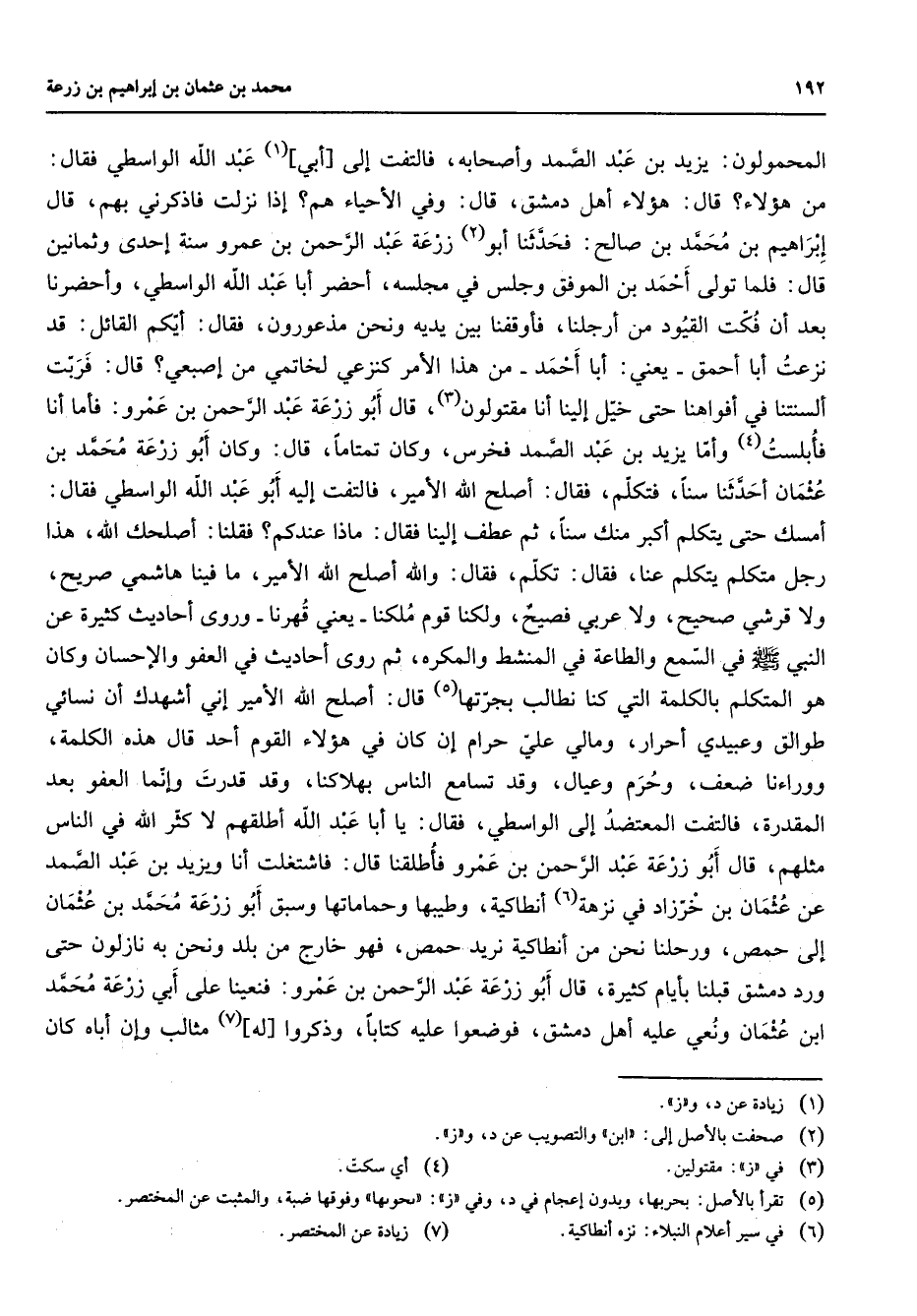 المحمولون يزيد بن عبد الصمد وأصحابه فالتفت إلى أبي (1) عبد الله الواسطي فقال من هؤلاء قال هؤلاء أهل دمشق قال وفي الأحياء هم إذا نزلت فاذكرني بهم قال إبراهيم بن محمد بن صالح فحدثنا أبو زرعة عبد الرحمن بن عمرو سنة إحدى وثمانين قال فلما تولى أحمد بن الموفق وجلس في مجلسه أحضر أبا عبد الله الواسطي وأحضرنا بعد أن فكت القيود من أرجلنا فأوقفنا بين يديه ونحن مذعورون فقال أيكم القائل قد نزعت أبا أحمق يعني أبا أحمد من هذا الأمر كنزعي لخاتمي من إصبعي قال فربت ألسنتنا في أفواهنا حتى خيل إلينا أنا مقتولون (3) قال أبو زرعة عبد الرحمن بن عمرو فأما أنا فأبلست (4) وأما يزيد بن عبد الصمد فخرس وكان تمتاما قال وكان أبو زرعة محمد بن عثمان أحدثنا سنا فتكلم فقال أصلح الله الأمير فالتفت إليه أبو عبد الله الواسطي فقال أمسك حتى يتكلم أكبر منك سنا ثم عطف إلينا فقال ماذا عندكم فقلنا أصلحك الله هذا رجل متكلم عنا فقال تكلم فقال والله أصلح الله الأمير ما فينا هاشمي صريح ولا قرشي صحيح ولا عربي فصيح ولكنا قوم ملكنا يعني قهرنا وروى أحاديث كثيرة عن النبي (صلى الله عليه وسلم) في السمع والطاعة في المنشط والمكره ثم روى أحاديث في العفو والإحسان وكان هو المتكلم بالكلمة التي كنا نطالب بجرتها (5) قال أصلح الله الأمير إني أشهدك أن نسائي طوالق وعبيدي أحرار ومالي علي حرام إن كان في هؤلاء القوم أحد قال هذه الكلمة ووراءنا ضعف وحرم وعيال وقد تسامع الناس بهلاكنا وقد قدرت وإنما العفو بعد المقدرة فالتفت المعتضد إلى الواسطي فقال يا أبا عبد الله أطلقهم لا كثر الله في الناس مثلهم قال أبو زرعة عبد الرحمن بن عمرو فأطلقنا قال فاشتغلت أنا ويزيد بن عبد الصمد عن عثمان بن خرزاد في نزهة (6) أنطاكية وطيبها وحماماتها وسبق أبو زرعة محمد بن عثمان إلى حمص ورحلنا نحن من أنطاكية نريد حمص فهو خارج من بلد ونحن به نازلون حتى ورد دمشق قبلنا بأيام كثيرة قال أبو زرعة عبد الرحمن بن عمرو فنعينا على أبي زرعة محمد ابن عثمان ونعي عليه أهل دمشق فوضعوا عليه كتابا وذكروا له (7) مثالب وإن أباه كان