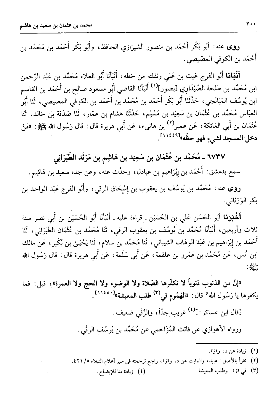 6737 - محمد بن عثمان بن سعيد بن هاشم بن مرثد الطبراني سمع بدمشق أحمد بن إبراهيم بن عبادل وحدث عنه وعن جده سعيد بن هاشم روى عنه محمد بن يوسف بن يعقوب بن إسحاق الرقي وأبو الفرج عبد الواحد بن بكر الورثاني أخبرنا أبو الحسن علي بن الحسين قراءة عليه أنبأنا أبو الحسين بن أبي نصر سنة ثلاث وأربعين أنبأنا محمد بن يوسف بن يعقوب الرقي ثنا محمد بن عثمان الطبراني ثنا أحمد بن إبراهيم بن عبد الوهاب الشيباني ثنا محمد بن سلام ثنا يحيى بن بكير عن مالك ابن أنس عن محمد بن عمرو بن علقمة عن أبي سلمة عن أبي هريرة قال قال رسول الله (صلى الله عليه وسلم) إن من الذنوب ذنوبا لا تكفرها الصلاة ولا الوضوء ولا الحج ولا العمرة قيل فما يكفرها يا رسول الله قال الهموم في (3) طلب المعيشة