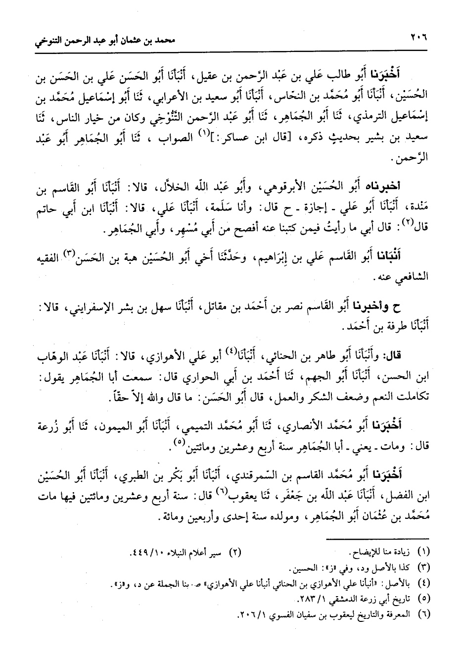 أخبرنا أبو طالب علي بن عبد الرحمن بن عقيل أنبأنا أبو الحسن علي بن الحسن بن الحسين أنبأنا أبو محمد بن النحاس أنبأنا أبو سعيد بن الأعرابي ثنا أبو إسماعيل محمد بن إسماعيل الترمذي ثنا أبو الجماهر ثنا أبو عبد الرحمن التنوخي وكان من خيار الناس ثنا سعيد بن بشير بحديث ذكره قال ابن عساكر (1) الصواب ثنا أبو الجماهر أبو عبد الرحمن أخبرناه أبو الحسين الأبرقوهي وأبو عبد الله الخلال قالا أنبأنا أبو القاسم بن مندة أنبأنا أبو علي إجازة قال وأنا سلمة أنبأنا علي قالا أنبأنا ابن أبي حاتم قال (2) قال أبي ما رأيت فيمن كتبنا عنه أفصح من أبي مسهر وأبي الجماهر أنبأنا أبو القاسم علي بن ابراهيم وحدثنا أخي أبو الحسين هبة بن الحسن الفقيه (3) الشافعي عنه ح وأخبرنا أبو القاسم نصر بن أحمد بن مقاتل أنبأنا سهل بن بشر الإسفرايني قالا أنبأنا طرفة بن أحمد قال وأنبأنا أبو طاهر بن الحنائي أنبأنا (4) أبو علي الأهوازي قالا أنبأنا عبد الوهاب ابن الحسن أنبأنا أبو الجهم ثنا أحمد بن أبي الحواري قال سمعت أبا الجماهر يقول تكاملت النعم وضعف الشكر والعمل قال أبو الحسن ما قال والله إلا حقا أخبرنا أبو محمد الأنصاري ثنا أبو محمد التميمي أنبأنا أبو الميمون ثنا أبو زرعة قال ومات يعني أبا الجماهر سنة أربع وعشرين ومائتين (5) أخبرنا أبو محمد القاسم بن السمرقندي أنبأنا أبو بكر بن الطبري أنبأنا أبو الحسين ابن الفضل أنبأنا عبد الله بن جعفر ثنا يعقوب قال سنة أربع وعشرين ومائتين فيها مات محمد بن عثمان أبو الجماهر ومولده سنة إحدى وأربعين ومائة