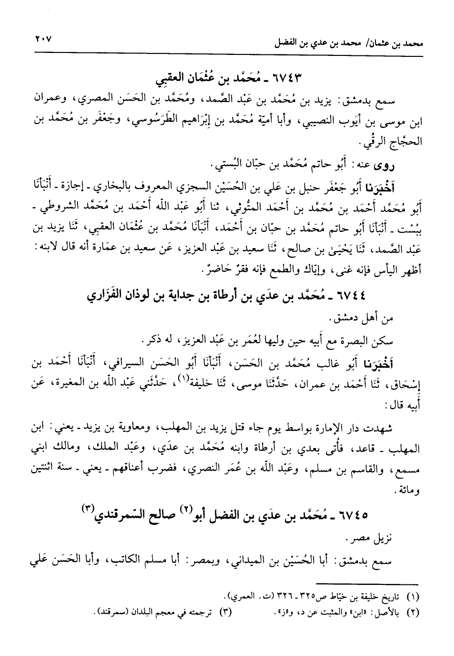 6745 - محمد بن عدي بن الفضل أبو (2) صالح السمرقندي (3) نزيل مصر سمع بدمشق أبا الحسين بن الميداني وبمصر أبا مسلم الكاتب وأبا الحسن علي