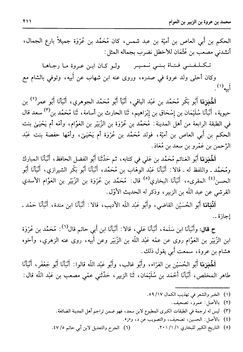 الحكم بن أبي العاص بن أمية بن عبد شمس كان محمد بن عروة جميلا بارع الجمال أنشدني مصعب بن عثمان للأخطل نضرب بجماله المثل * تكلفني فتاة بني نمير * ولو كان ابن عروة ما رجاها * وكان أحلى ولد عروة في صدره وروى عنه ابن شهاب عن أبيه وتوفي بالشام مع أبيه (1) أخبرنا أبو بكر محمد بن عبد الباقي أنبأنا أبو محمد الجوهري أنبأنا أبو عمر (2) بن حيوية أنبأنا سليمان بن إسحاق بن إبراهيم ثنا الحارث بن أسامة ثنا محمد بن (3) سعد قال في الطبقة الرابعة من أهل المدينة محمد بن عروة بن الزبير بن العوام وأمه أم يحيى بنت الحكم بن أبي العاص بن أمية فولد محمد بن عروة أم يحيى وأمها حفصة بنت عبد الرحمن بن عمرو بن سعد بن معاذ أخبرنا أبو الغنائم محمد بن علي في كتابه ثم حدثنا أبو الفضل الحافظ أنبأنا المبارك ومحمد واللفظ له قالا أنبأنا عبد الوهاب بن محمد أنبأنا أبو بكر الشيرازي أنبأنا أبو الحسن (4) المقرئ أنبأنا البخاري (5) قال محمد بن عروة بن الزبير بن العوام الأسدي القرشي عن عبد الله بن الزبير وذكر له الحديث الأول أنبأنا أبو الحسين القاضي وأبو عبد الله الأديب قالا أنبأنا ابن مندة أنبأنا حمد إجازة ح قال وأنبأنا ابن سلمة أنبأنا علي قالا أنبأنا ابن أبي حاتم قال (6) محمد بن عروة ابن الزبير بن العوام روى عن عمه عبد الله بن الزبير وعن أبيه روى عنه الزهري وأخوه هشام بن عروة سمعت أبي يقول ذلك أخبرنا أبو الحسين بن الفراء وأبو غالب وأبو عبد الله قالوا أنبأنا أبو جعفر أنبأنا طاهر المخلص أنبأنا أحمد بن سليمان ثنا الزبير حدثني عمي مصعب بن عبد الله قال