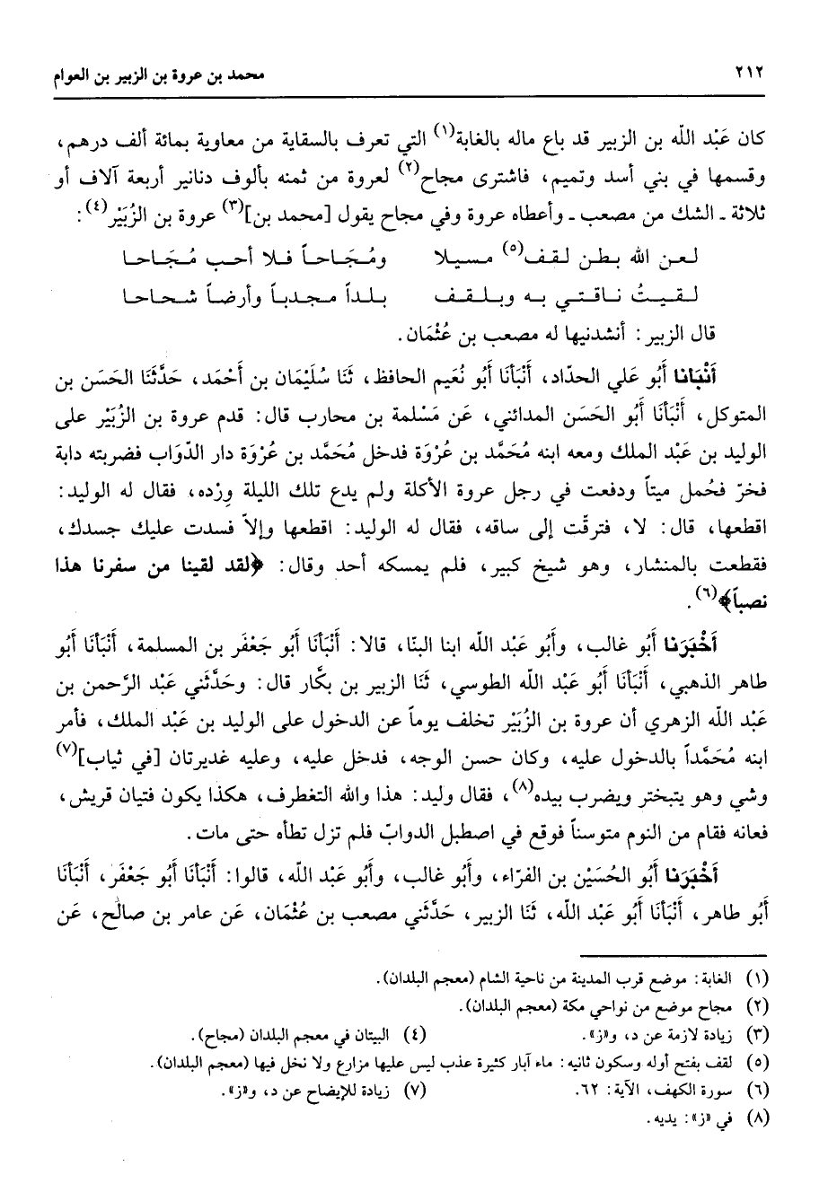 كان عبد الله بن الزبير قد باع ماله بالغابة (1) التي تعرف بالسقاية من معاوية بمائة ألف درهم وقسمها في بني أسد وتميم فاشترى مجاح (2) لعروة من ثمنه بألوف دناينر أربعة آلاف أو ثلاثة الشك من مصعب وأعطاه عروة وفي مجاح يقول محمد بن (3) عروة بن الزبير (4) * لعن الله بطن لقف (5) مسيلا * ومجاحا فلا أحب مجاحا لقيت ناقتي به وبلقف * بلدا مجدبا وأرضا شحاحا * قال الزبير أنشدنيها له مصعب بن عثمان أنبأنا أبو علي الحداد أنبأنا أبو نعيم الحافظ ثنا سليمان بن أحمد حدثنا الحسن بن المتوكل أنبأنا أبو الحسن المدائني عن مسلمة بن محارب قال قدم عروة بن الزبير على الوليد بن عبد الملك ومعه ابنه محمد بن عروة فدخل محمد بن عروة دار الدواب فضربته دابة فخر فحمل ميتا ودفعت في رجل عروة الأكلة ولم يدع تلك الليلة ورده فقال له الوليد اقطعها قال لا فترقت إلى ساقه فقال له الوليد اقطعها وإلا فسدت عليك جسدك فقطعت بالمنشار وهو شيخ كبير فلم يمسكه أحد وقال " لقد لقينا من سفرنا هذا نصبا " (6) أخبرنا أبو غالب وأبو عبد الله ابنا البنا قالا أنبأنا أبو جعفر بن المسلمة أنبأنا أبو طاهر الذهبي أنبأنا أبو عبد الله الطوسي ثنا الزبير بن بكار قال وحدثني عبد الرحمن بن عبد الله الزهري أن عروة بن الزبير تخلف يوما عن الدخول على الوليد بن عبد الملك فأمر ابنه محمدا بالدخول عليه وكان حسن الوجه فدخل عليه وعليه غديرتان في ثياب (7) وشي وهو يتبختر ويضرب بيده (8) فقال وليد هذا والله التغطرف هكذا يكون فتيان قريش فعانه فقام من النوم متوسنا فوقع في اصطبل الدواب فلم تزل تطأه حتى مات أخبرنا أبو الحسين بن الفراء وأبو غالب وأبو عبد الله قالوا أنبأنا أبو جعفر أنبأنا أبو طاهر أنبأنا أبو عبد الله ثنا الزبير حدثني مصعب بن عثمان عن عامر بن صالح عن