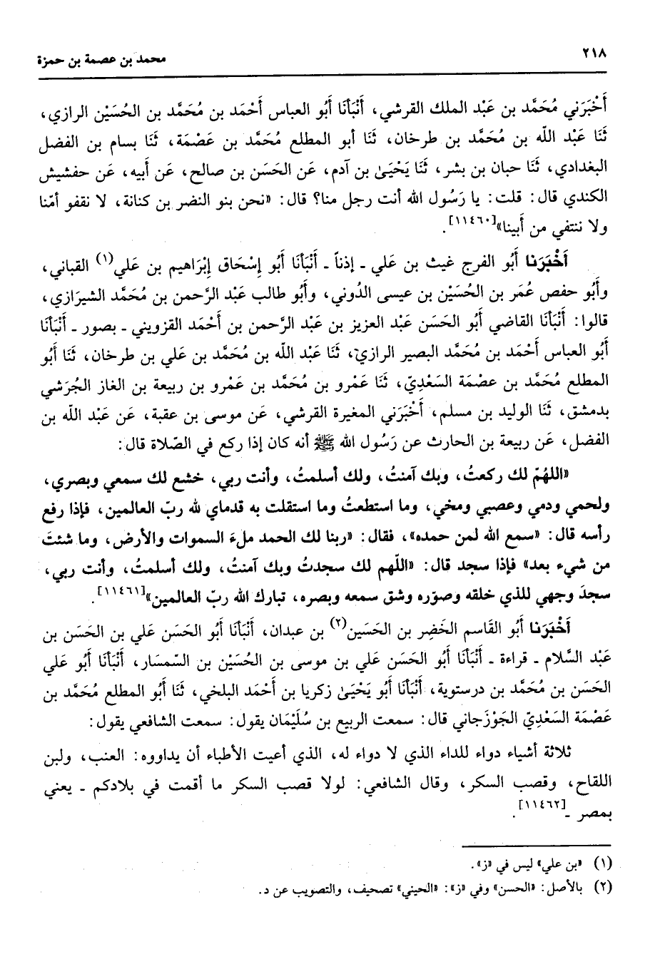 [11460] أخبرنا أبو الفرج غيث بن علي إذنا أنبأنا أبو إسحاق إبراهيم بن علي (1) القباني وأبو حفص عمر بن الحسين بن عيسى الدوني وأبو طالب عبد الرحمن بن محمد الشيرازي قالوا أنبأنا القاضي أبو الحسن عبد العزيز بن عبد الرحمن بن أحمد القزويني بصور انبأنا أبو العباس أحمد بن محمد البصير الرازي ثنا عبد الله بن محمد بن علي بن طرخان ثنا أبو المطلع محمد بن عصمة السعدي ثنا عمرو بن محمد بن عمرو بن ربيعة بن الغاز الجرشي بدمشق ثنا الوليد بن مسلم أخبرني المغيرة القرشي عن موسى بن عقبة عن عبد الله بن الفضل عن ربيعة بن الحارث عن رسول الله (صلى الله عليه وسلم) أنه كن إذا ركع في الصلاة قال اللهم لك ركعت وبك آمنت ولك أسلمت وأنت ربي خشع لك سمعي وبصري ولحمي ودمي وعصبي ومخي وما استطعت وما استقلت به قدماي لله رب العالمين فإذا رفع رأسه قال سمع الله لمن حمده فقال ربنا لك الحمد ملء السموات والأرض وما شئت من شئ بعد فإذا سجد قال اللهم لك سجدت وبك آمنت ولك أسلمت وأنت ربي سجد وجهي للذي خلقه وصوره وشق سمعه وبصره تبارك الله رب العالمين