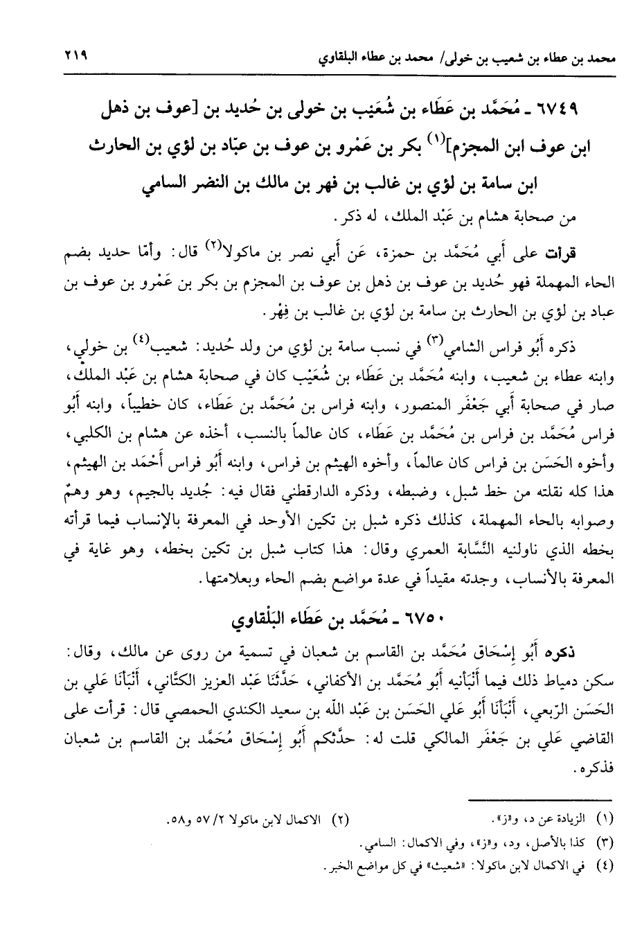 6749 - محمد بن عطاء بن شعيب بن خولى بن حديد بن عوف بن ذهل ابن عوف ابن المجزم (1) بكر بن عمرو بن عوف بن عباد بن لؤي بن الحارث ابن سامة بن لؤي بن غالب بن فهر بن مالك بن النضر السامي من صحابة هشام بن عبد الملك له ذكر قرأت على أبي محمد بن حمزة عن أبي نصر بن ماكولا (2) قال وأما حديد بضم الحاء المهملة فهو حديد بن عوف بن ذهل بن عوف بن المجزم بن بكر بن عمرو بن عوف بن عباد بن لؤي بن الحارث بن سامة بن لؤي بن غالب بن فهر ذكره أبو فراس الشامي (3) في نسب سامة بن لؤي من ولد حديد شعيب (4) بن خولي وابنه عطاء بن شعيب وابنه محمد بن عطاء بن شعيب كان في صحابة هشام بن عبد الملك صار في صحابة أبي جعفر المنصور وابنه فراس بن محمد بن عطاء كان خطيبا وابنه أبو فراس محمد بن فراس بن محمد بن عطاء كان عالما بالنسب أخذه عن هشام بن الكلبي وأخوه الحسن بن فراس كان عالما وأخوه الهيثم بن فراس وابنه أبو فراس أحمد بن الهيثم هذا كله نقلته من خط شبل وضبطه وذكره الدارقطني فقال فيه جديد بالجيم وهو وهم وصوابه بالحاء المهملة كذلك ذكره شبل بن تكين الأوحد في المعرفة بالإنساب فيما قرأته بخطه الذي ناولنيه النسابة العمري وقال هذا كتاب شبل بن تكين بخطه وهو غاية في المعرفة بالأنساب وجدته مقيدا في عدة مواضع بضم الحاء وبعلامتها