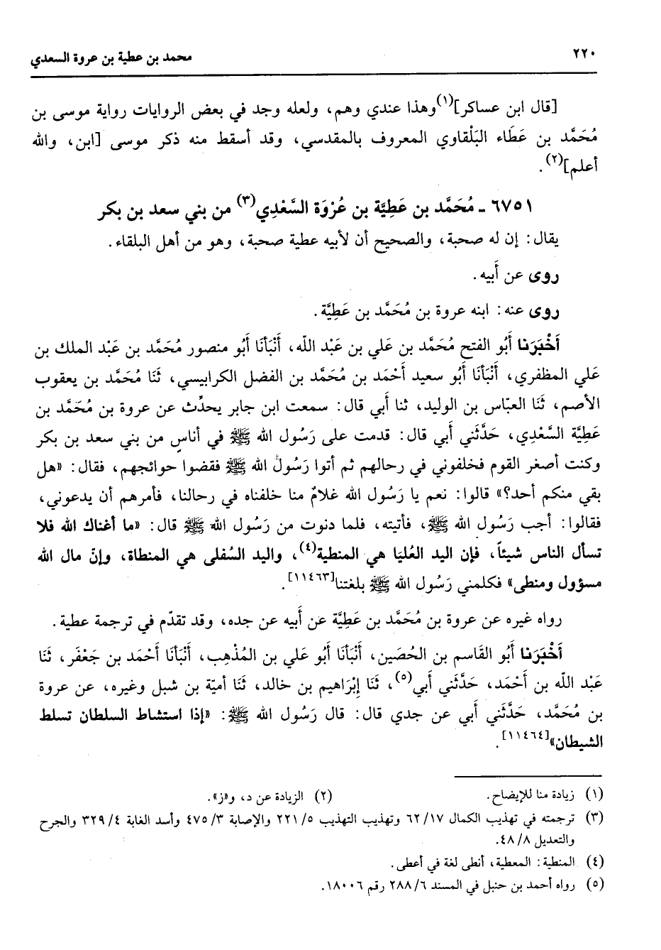 6751 - محمد بن عطية بن عروة السعدي (3) من بني سعد بن بكر يقال إن له صحبة والصحيح أن لأبيه عطية صحبة وهو من أهل البلقاء روى عن أبيه روى عنه ابنه عروة بن محمد بن عطية أخبرنا أبو الفتح محمد بن علي بن عبد الله أنبأنا أبو منصور محمد بن عبد الملك بن علي المظفري أنبأنا أبو سعيد أحمد بن محمد بن الفضل الكرابيسي ثنا محمد بن يعقوب الأصم ثنا العباس بن الوليد ثنا أبي قال سمعت ابن جابر يحدث عن عروة بن محمد بن عطية السعدي حدثني أبي قال قدمت على رسول الله (صلى الله عليه وسلم) في أناس من بني سعد بن بكر وكنت أصغر القوم فخلفوني في رحالهم ثم أتوا رسول الله (صلى الله عليه وسلم) فقضوا حوائجهم فقال هل بقي منكم أحد قالوا نعم يا رسول الله غلام منا خلفناه في رحالنا فأمرهم أن يدعوني فقالوا أجب رسول الله (صلى الله عليه وسلم) فأتيته فلما دنوت من رسول الله (صلى الله عليه وسلم) قال ما أغناك الله فلا تسأل الناس شيئا فإن اليد العليا هي المنطية (4) واليد السفلى هي المنطاة وإن مال الله مسؤول ومنطى فكلمني رسول الله (صلى الله عليه وسلم) بلغتنا